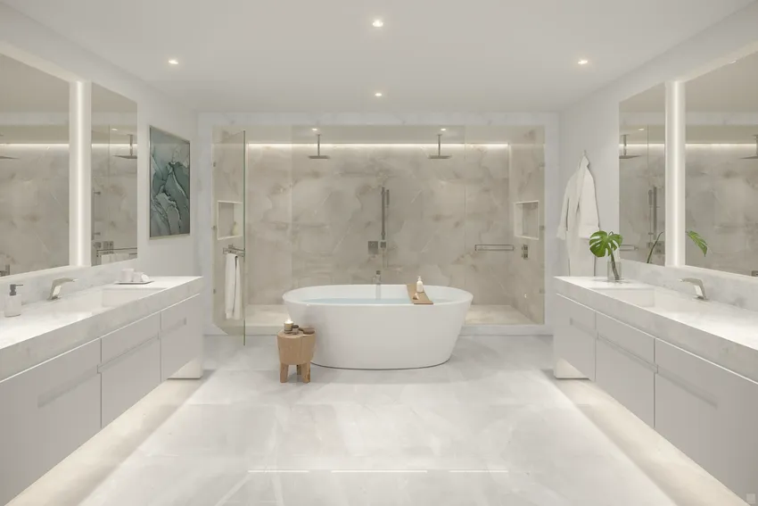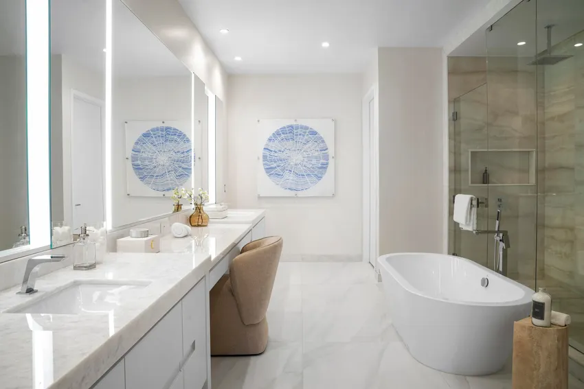 - Primary bathrooms with marble finishes, freestanding bathtubs, and glass-enclosed showers