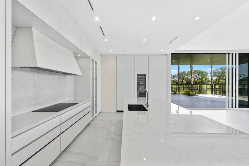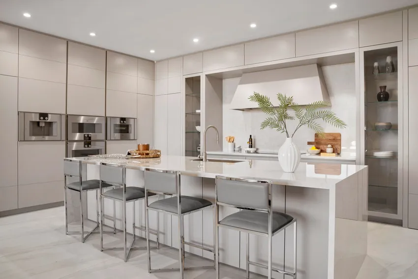 - Kitchen islands with waterfall countertops, Gaggenau appliances