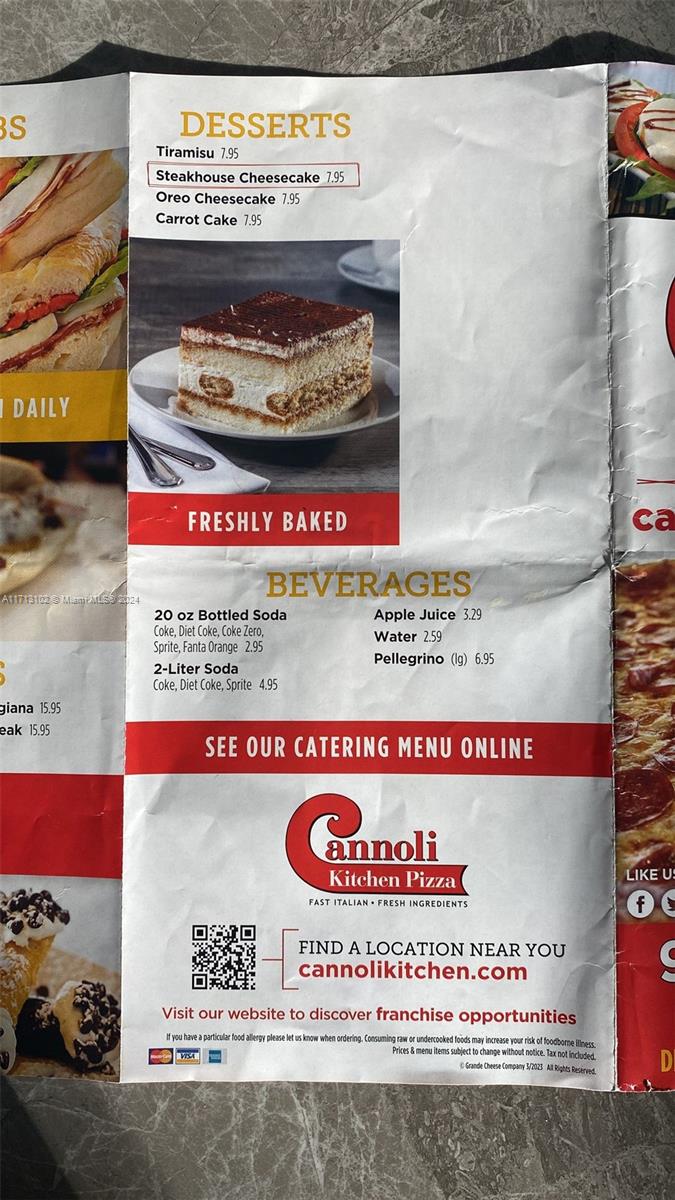 BUSINESS ONLY FOR SALE. Specializing in authentic Italian pizzas, Cannoli Kitchen stands out for its homemade recipes, fresh ingredients, and dough prepared daily on site. In addition to pizza, the menu includes a mouth-watering selection of cannolis, calzones, and classic Italian dishes, perfect for satisfying your every craving. Whether for a quick lunch break, a convivial dinner or an impromptu evening, Cannoli Kitchen combines simplicity, taste, and fast service to delight lovers of Italian cuisine. Takeout or delivery, enjoy a piece of Italy without leaving Deerfield Beach.