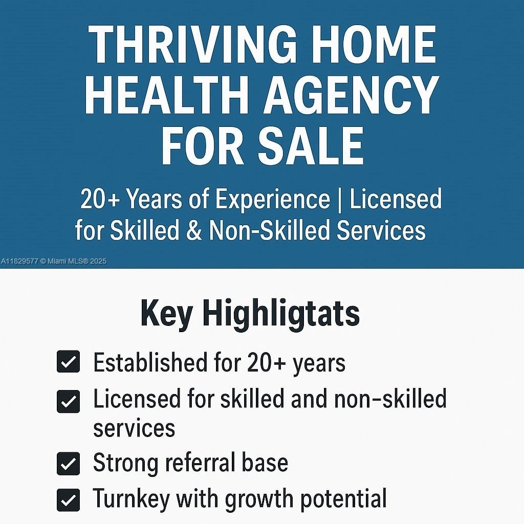 An exceptional opportunity to acquire a well-established and fully licensed home health agency with over 20 years of operational excellence. This agency is licensed for both skilled nursing and non-skilled services, serving a diverse patient population with a strong reputation for compassionate, high-quality care. Located in a high-demand area, the business boasts a robust referral base, well-developed compliance systems, and long-standing relationships with healthcare professionals, hospitals, and insurers. The agency holds all required state and federal licenses and maintains excellent standing with regulatory agencies. This is a turnkey business ready for transition. Training and support available. NDA required for full details.