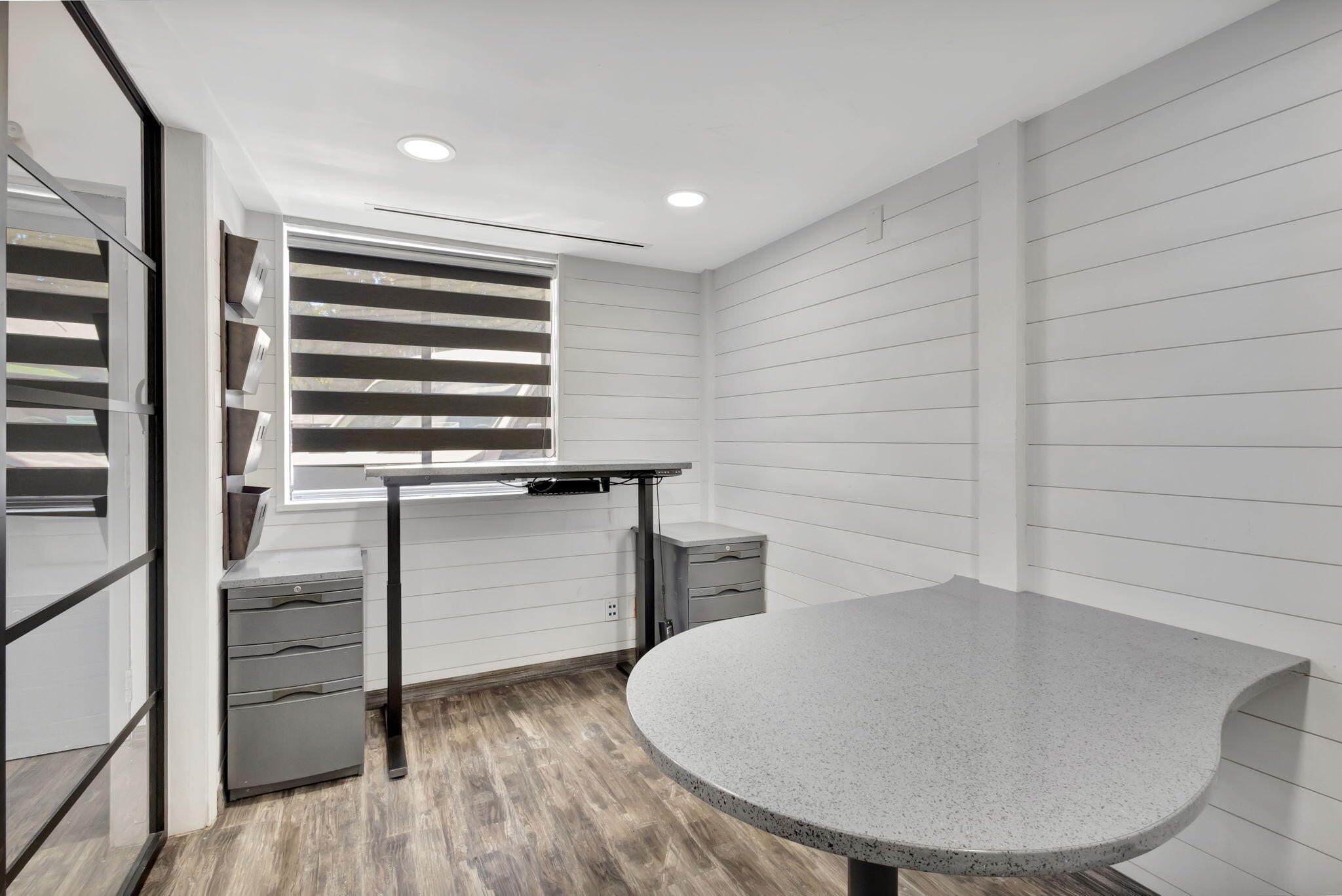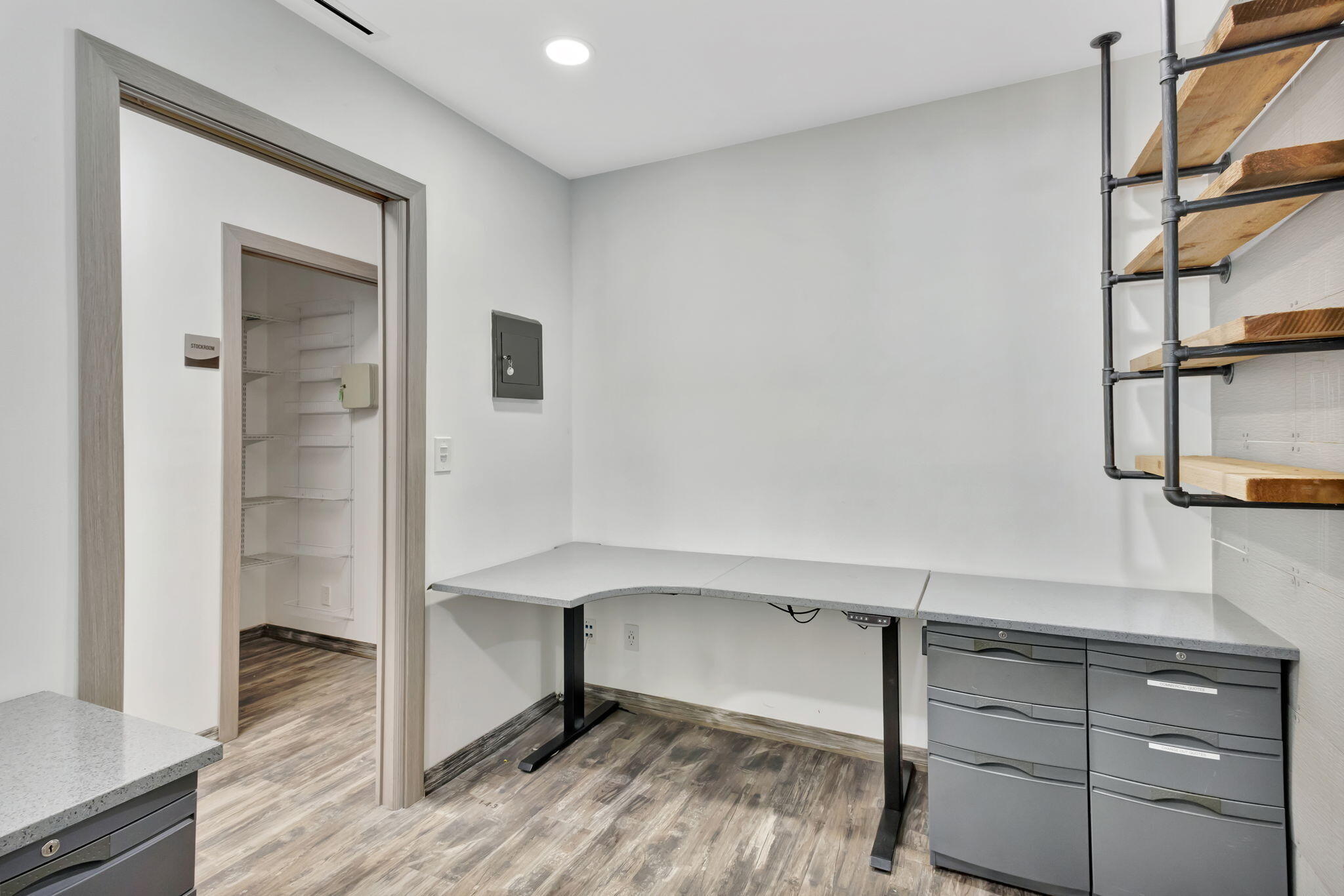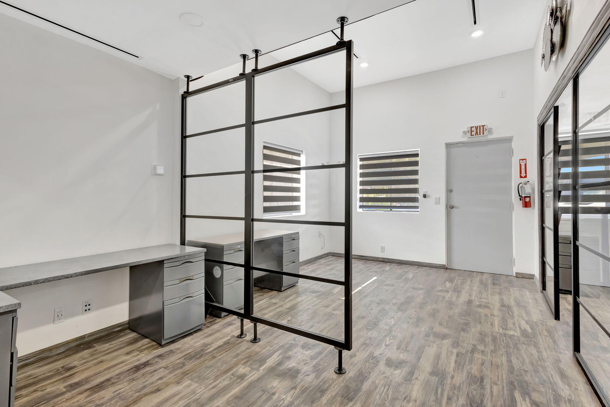 RARE OPPORTUNITY to own this 1190 SF, end-cap warehouse/office in central Jupiter. The space is equally divided into half office/half warehouse. The front of the unit has 3 light-filled renovated offices, a break-room with fridge, sink, and room for a table, and a renovated bathroom. The clean warehouse space has 16-foot ceilings, lofted storage space, 2 equipment storage cages, and a bay door that opens onto a double-wide driveway. 100% air-conditioned- 2 zones. Front and rear parking. MOVE-IN READY! Great location - one block in from Indiantown Rd and 5 minutes to 1-95.
