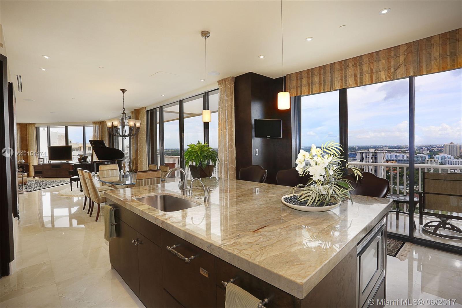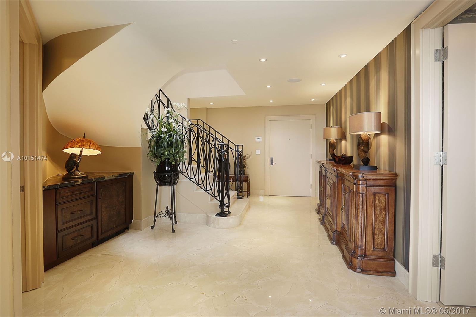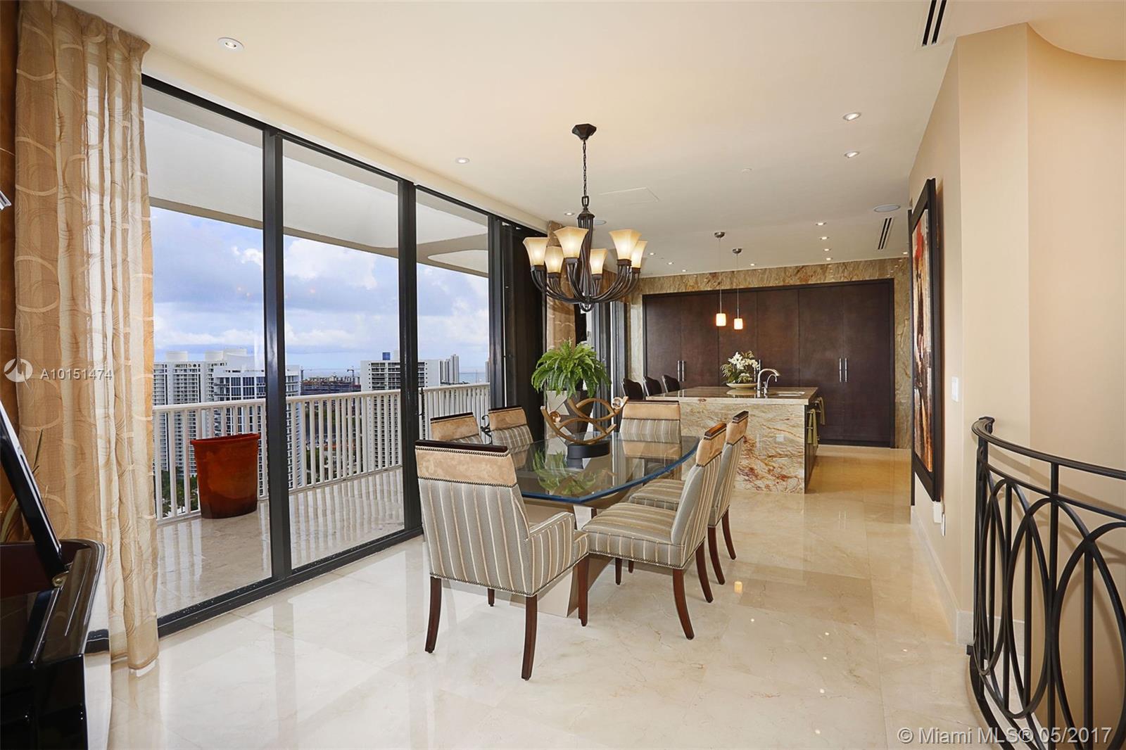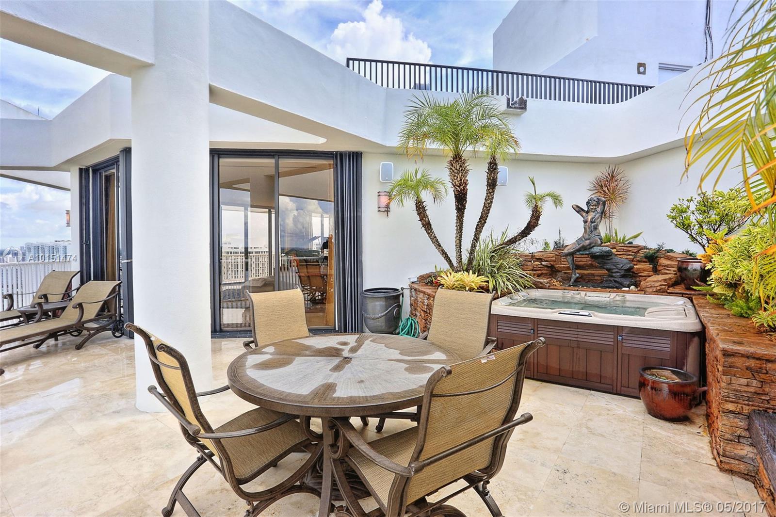Luxurious 2 story 3 bed/3.5 bath custom Penthouse with stunning bay and ocean views, with ample balcony and private spa, located on prestigious Williams Island. The sleek kitchen boasts stunning countertops and entire island made of impressive onyx and Subzero fridge. The majestic staircase is comprised of Italian Marble and custom wrought iron railings. Master bathroom features marble and Sherle Wagner faucets. Control4 system conveniently controls surround sound and blinds throughout. Available turnkey.