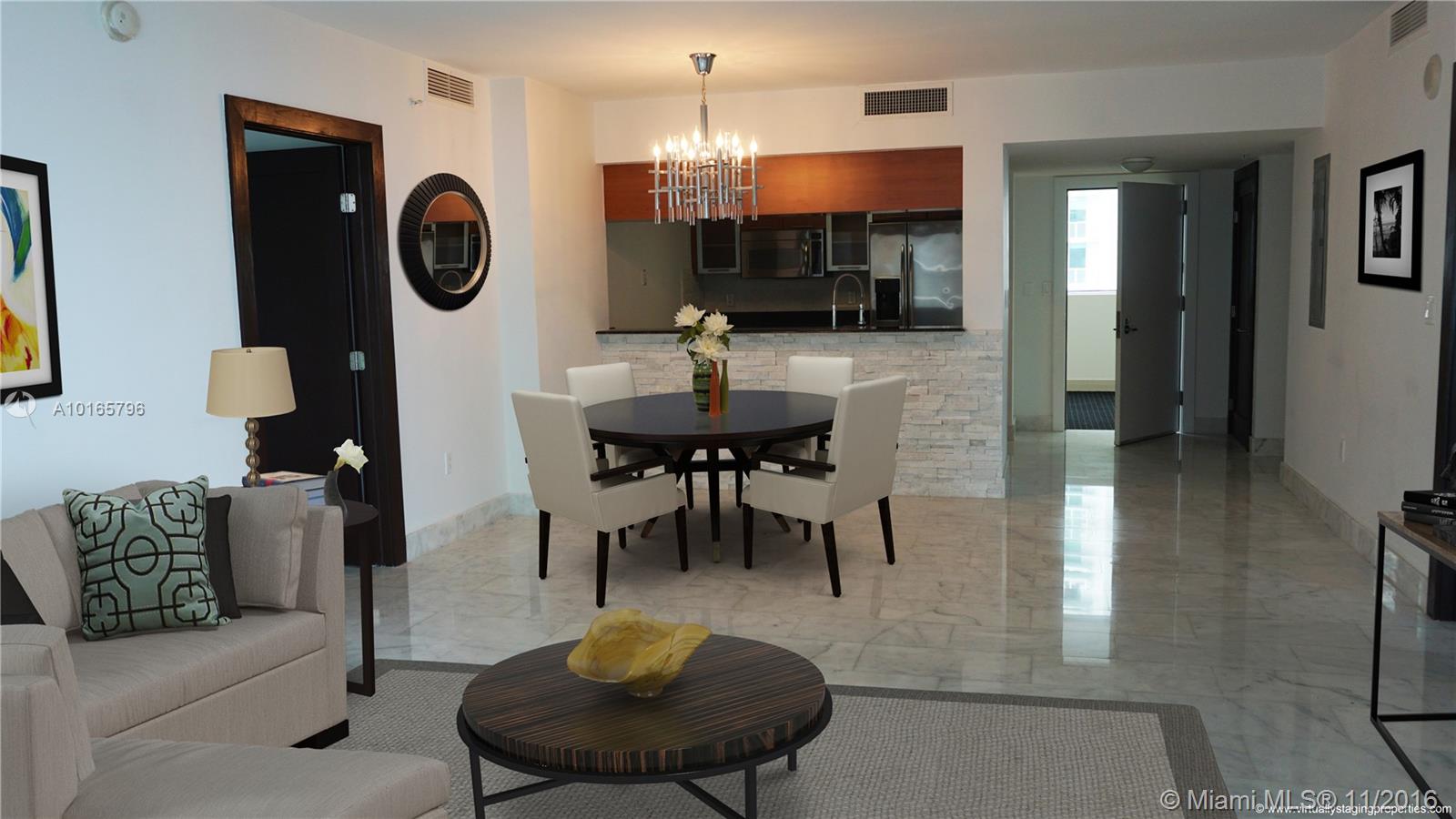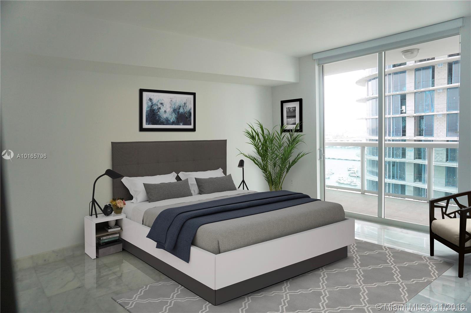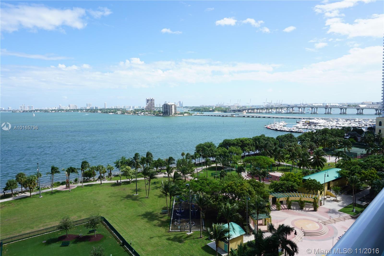 Spacious high floor, spectacular bay & city views with generous full length balcony, floor-to-ceiling impact windows. Amazing kitchen w designer appliances, granite & marble counters, custom built cabinets, imported white marble floors throughout, walk-in closets, glass shower & hot tub. World class amenities inc fitness center, sauna, massage & steam rooms, friendly concierge & valet. Low maintenance fees. Across from Margaret Pace Park offering tennis, basketball, volleyball, tot lot & pet play area.
