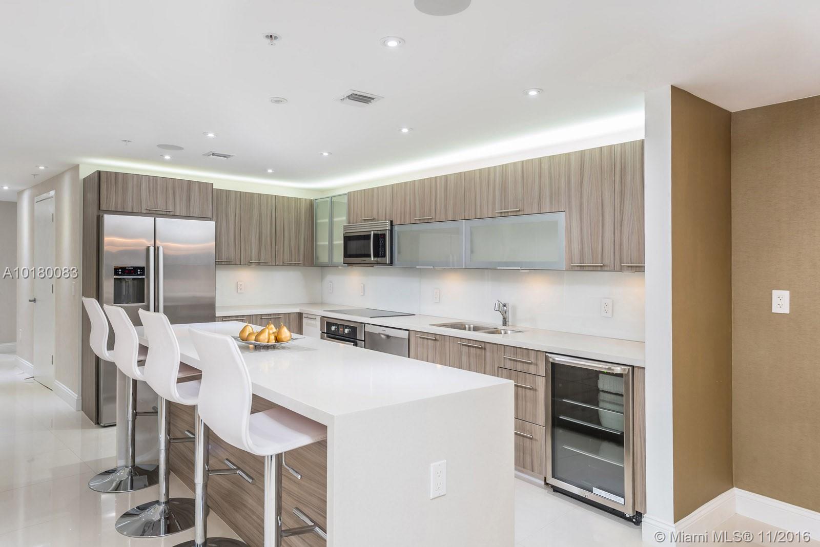Breathtaking Miami Skyline Sunsets from Wraparound balcony. New architect-designed remodeled apartment. Fully furnished & decorated. Integrated Sonos media system, recessed ceiling speakers throughout iPad controlled (included). Custom closets, private office, huge master bathroom, walk-in closets. Open kitchen, stainless steel appliances, wine cooler, eat in bar. 3 covered parking spaces, storage room. Private elevator. Gym, sauna, swimming pool & cabanas by the water. Across the street from the Sand.