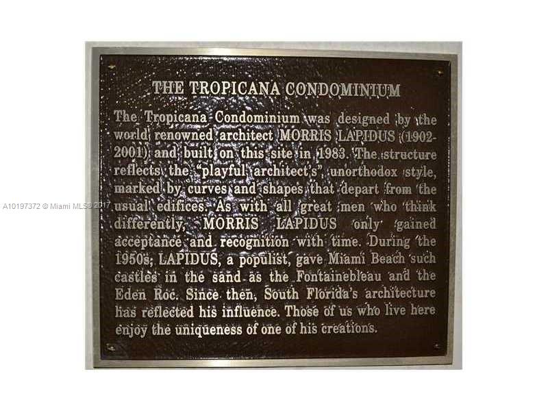 Panoramic direct ocean view apartment in boutique building designed by notorious Fontainebleau architect Morris Lapidus. Spacious and open living space with wrap-around balcony, open kitchen and hidden Murphy-bed. Large master bedroom. Second bedroom with separate door to balcony. Marble floors, concrete in bedrooms. Assigned storage unit. 24 hr lobby attendant. The Tropicana Condo is the first building in Sunny Isles Beach in prime location next to Haulover State Park & Marina.