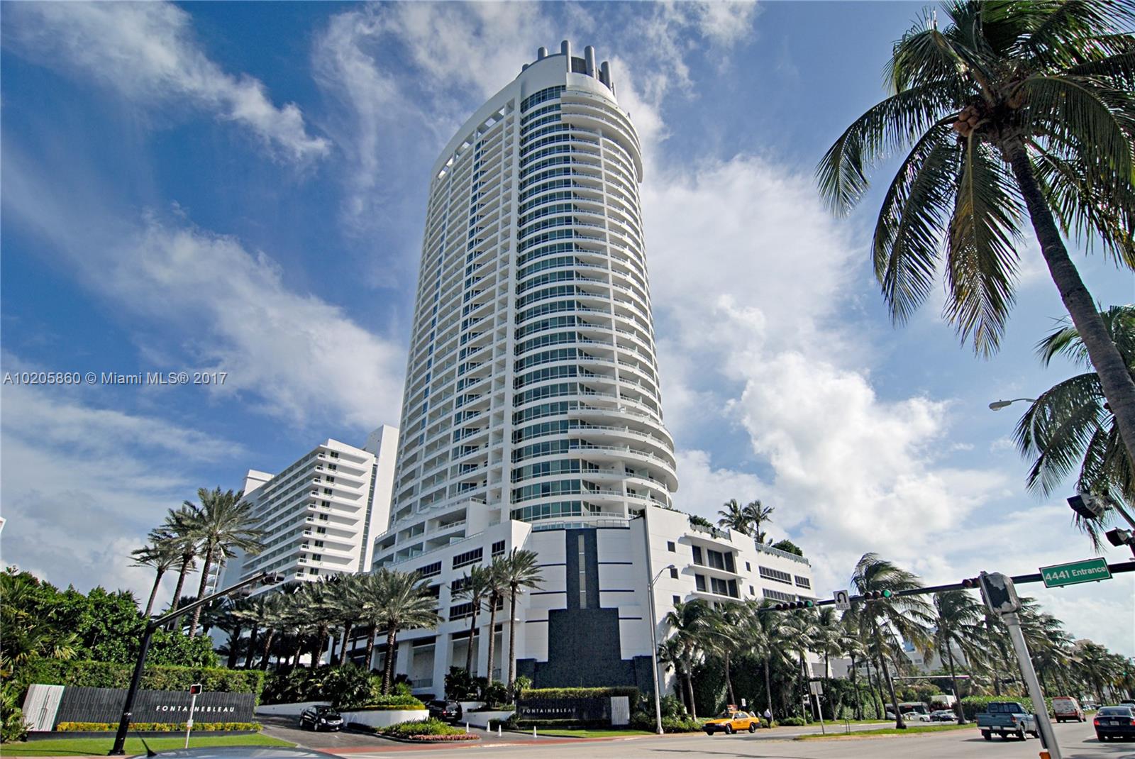 BEAUTIFUL JR SUITE/1 BATH WITH UNOBSTRUCTED OCEAN, BAY & CITY VIEWS. OWNER HAS OPTION OF ENROLLING IN HOTEL RENTAL PROGRAM. USE IT PART-TIME & RECEIVE INCOME WHILE YOU'RE AWAY! FULLY FURNISHED TURNKEY WITH SLEEPER SOFA AND KING BED. FONTAINEBLEAU OFFERS 22 OCEANFRONT ACRES, MANY TOP R RESTAURANTS, LIV NIGHT CLUB, 40,000SF STATE OF THE ART SPA & FITNESS CENTER. MAINTENANCE FEES INCLUDE: AC, LOCAL PHONES, ELECTRICITY, VALET AND DAILY FREE BREAKFAST IN OWNERS LOUNGE.