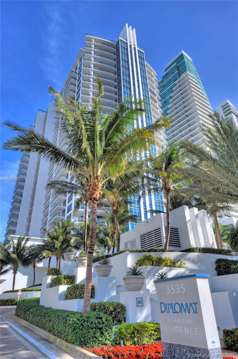 TURNKEY!!! BEST DEAL IN THE DIPLOMAT! BEAUTIFULLY FINISHED AND FURNISHED WITH SPECTACULAR DIRECT OCEAN AND BEACH VIEWS! SPACIOUS, 2300 SQ.FT. 2BED/2.5 BATH, OPEN, BRIGHT WITH EXTENSIVE CEILING WORK, PRIVATE ELEVATOR FOYER, MARBLE FLOORS, GOURMET KITCHEN W/ ITALIAN CABINETS, ALL VIKING APPLIANCES INCLUDING GAS STOVE!, TOTO TOILETS IN UPGRADED BATHROOMS, CALIFORNIA CLOSETS, BUILT-INS, ELECTRIC WINDOW COVERINGS, 2 BALCONIES. AMENITIES INCLUDE: PRIVATE THEATER ROOM, FITNESS CENTER, SAUNA, HEATED SALINE POOL, 24HR SECURITY,VALET AND DIRECT ACCESS TO NEXT DOOR WORLD CLASS HILTON DIPLOMAT RESORT & SPA W/ ROOM SERVICE TO 8 RESTAURANTS AND MORE!. A MUST SEE TO APPRECIATE!