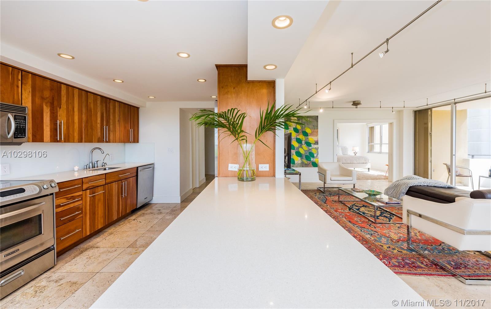 Spacious and full of natural light! Gorgeous bay and lush tropical treetop views from this luxurious updated Belle Isle-Venetian Islands 2 bedroom, 2.5 bathroom renovated corner residence. Bright, spacious, sophisticated open living/dining. Updated modern kitchen with sleek solid wood cabinets and quartz counter tops. Over-sized master bay-view bedroom suite with modern double-vanity master bath and large shower with subway tile. Spacious en-suite 2nd bedroom. Expansive entertainment balcony with bay and treetop views. Breathtaking views from building's private rooftop terrace. Amenities galore: spectacular waterfront restaurant, hotel style pool deck, boat slips, 24 hr concierge and valet, fitness center and sauna. Walk to Sunset Harbour, Lincoln Rd and Beach. MUST SEE VIRTUAL TOUR VIDEO.