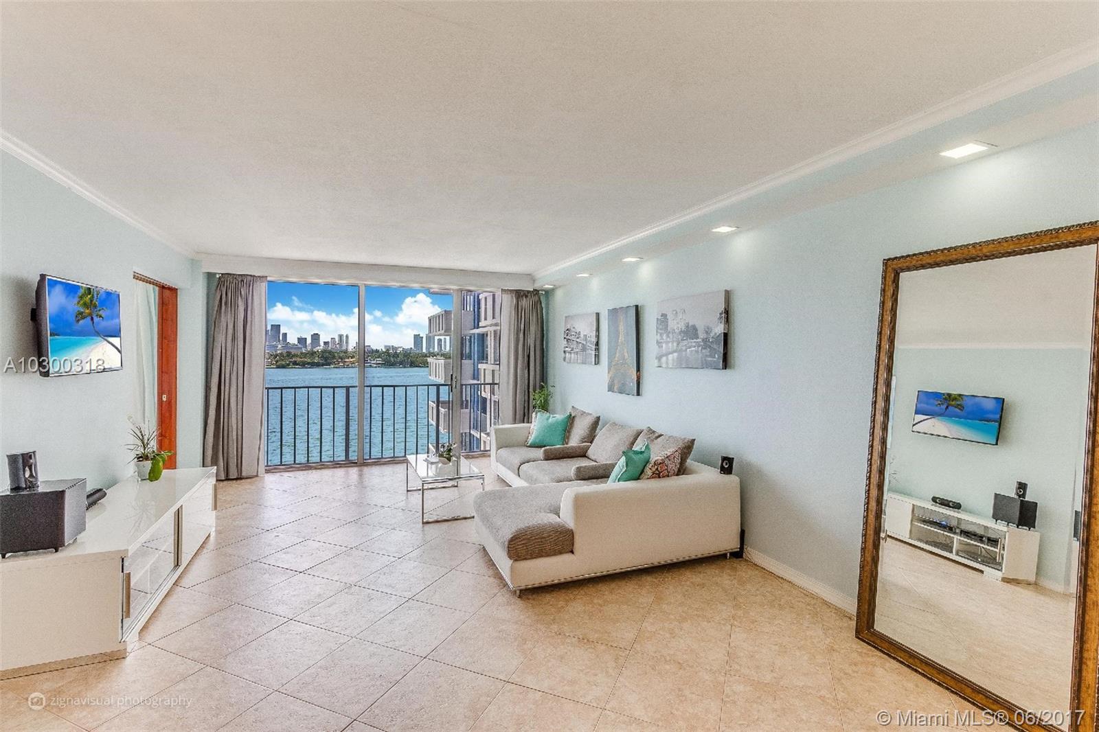 Floor-to-ceiling glass in the living room and bedroom. Stunning view day and night of Biscayne bay, the cruise ships, downtown skyline and Star Island. Renovated unit with tile flooring throughout, new kitchen with stainless steel appliance and granite countertop. New Bathroom. Prime location on West Avenue. Walking distance to all of South Beach. The building has a new open air lobby with a bayfront pool deck, docks, gym and more. Assigned covered parking included. Cable & Internet included in maintenance. Renting and pets allowed (up to 26 pounds).
