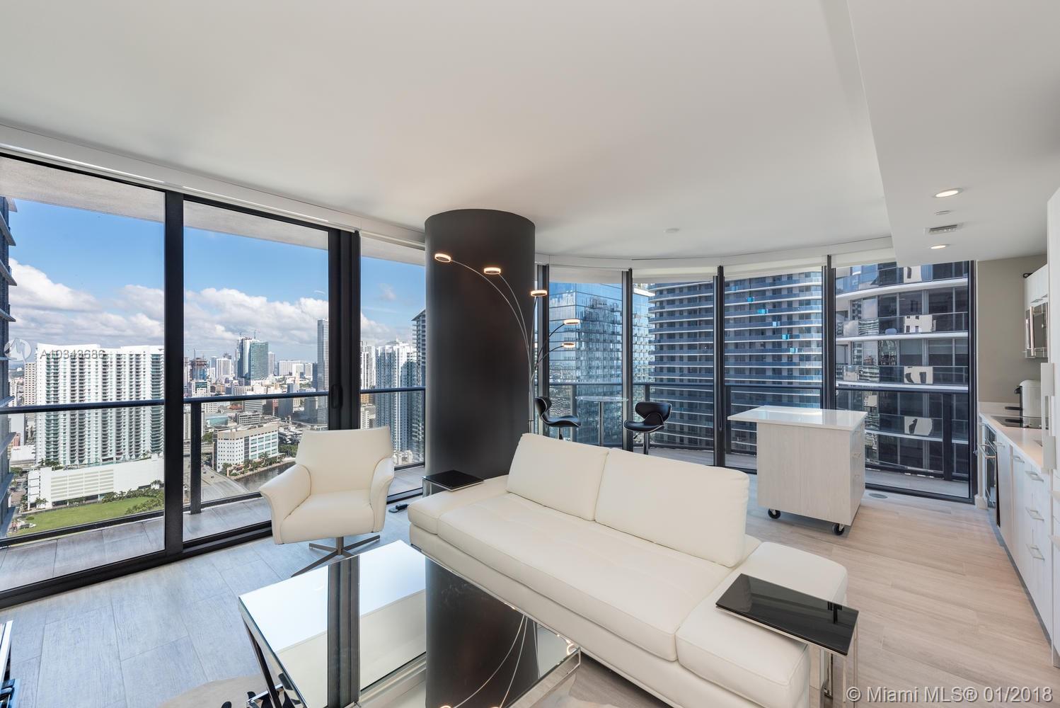 Turn key and ready to move into! Expansive and elevated clear view of Brickell River and City Center. Finished to perfection! Seller added approx. $45k in upgrades to include custom: porcelain wood floors with matching deck flooring, built out closets, window treatments with black out shades in bedrooms, mirrored kitchen backsplash to enhance view, tub/shower glass enclosure and floating kitchen island. Modani furniture & fixtures can be included in sale. This Condo has 1 of only 35 available storage units. Parking space is conveniently located on 3rd floor. Best location in the City, Equinox gym located in the complex, roof top pool, 1 block from City Center mall and cinema. **Fully furnished unit.**