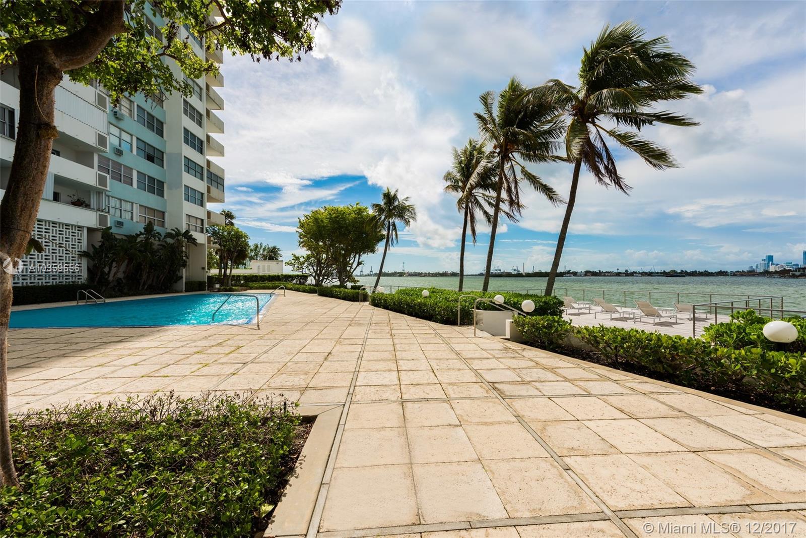 Northwest corner unit with unobstructed panoramic bay, and downtown skyline views. Located in Belle Isle on the Venetian Causeway, this tastefully updated Morris Lapidus signature designed mid-century co-op is within easy reach of Sunset Harbour and Lincoln Road. This ample, least expensive 2 bedroom 2 bath unit, with assigned parking, is beautifully maintained in its original condition, you can easily live in this retro-vibed unit or update it. Complimented by 24 hour security, gym, Bayfront pool area, this view filled central location and price cannot be beat.
