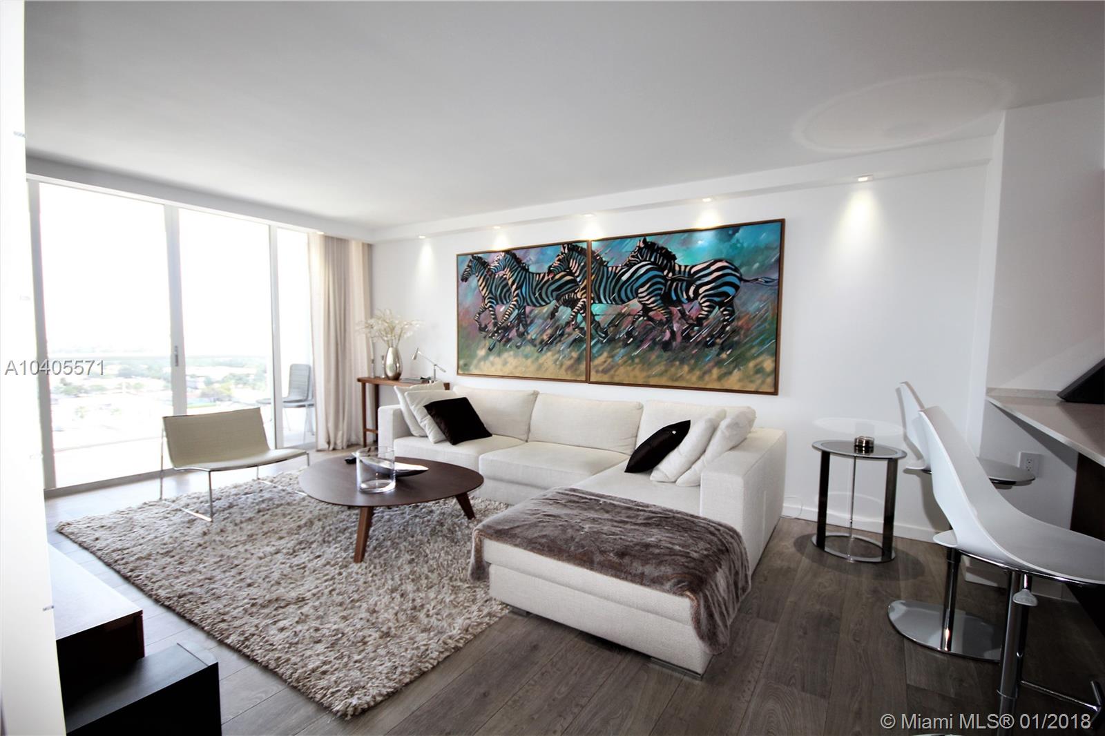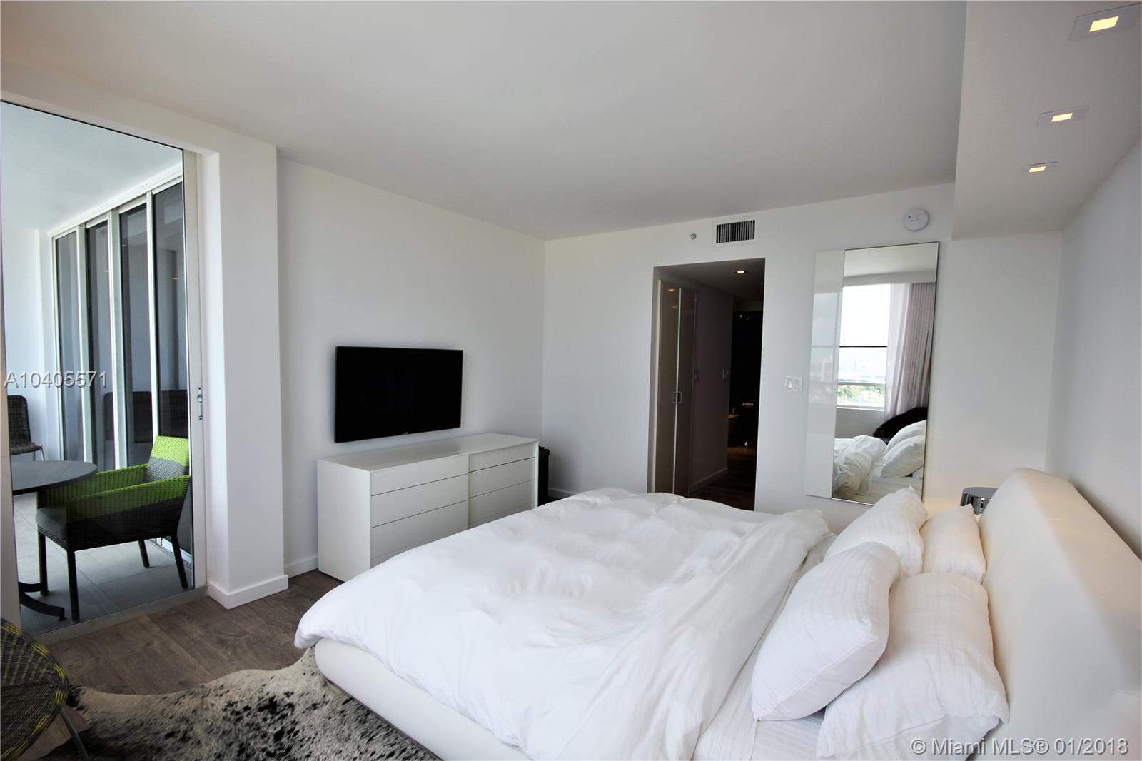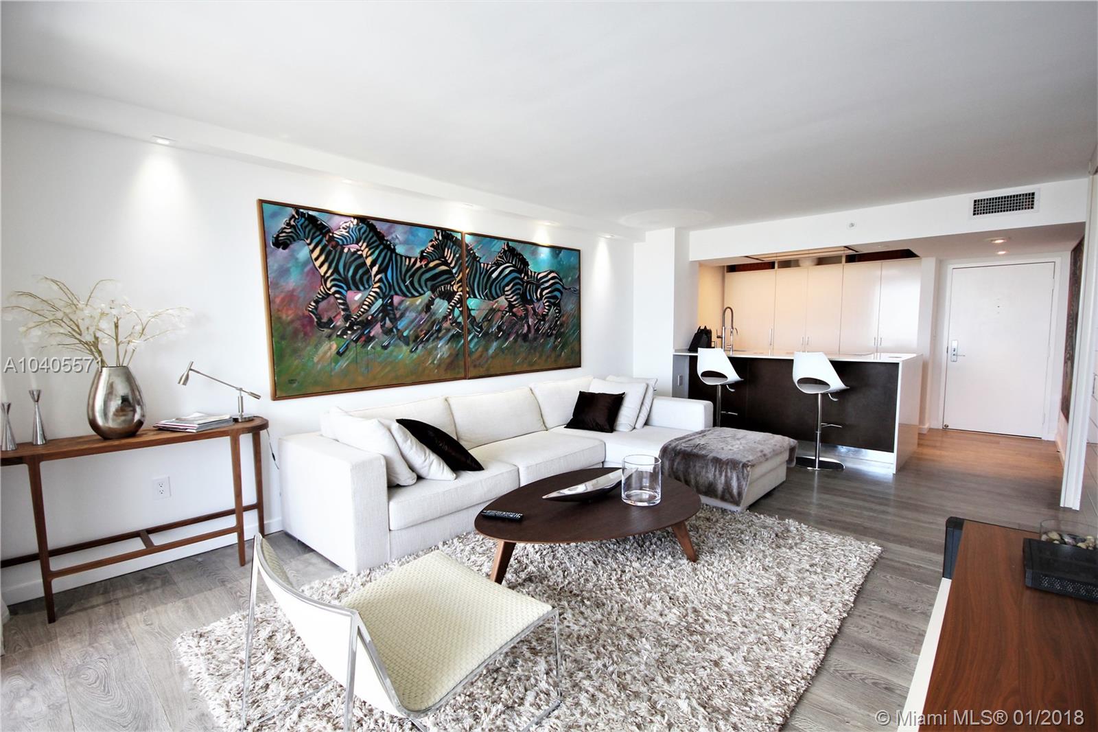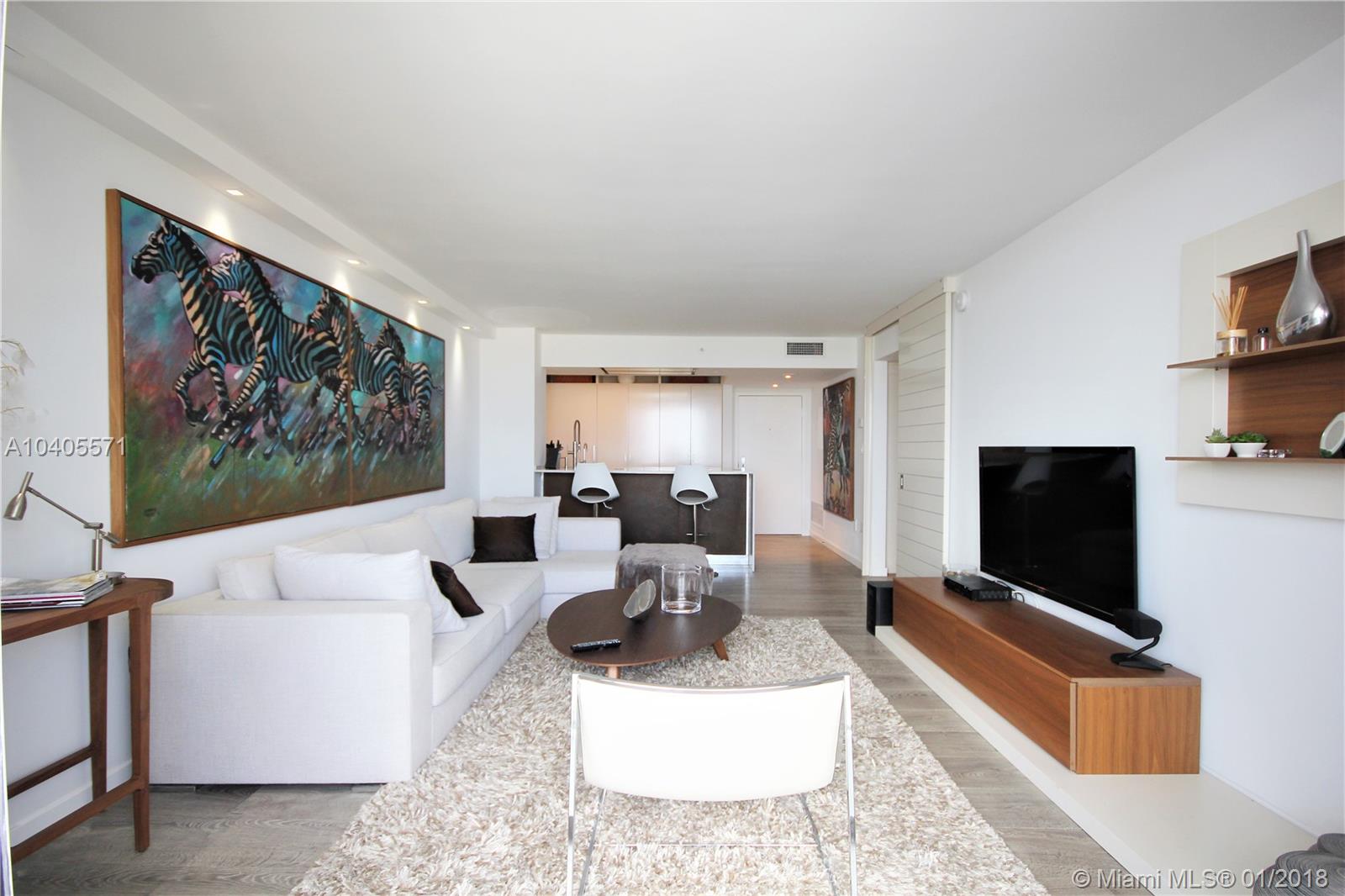 Recently remodeled to high-end quality perfection in impeccable condition with an awesome South Beach view. Open, spacious & bright living area w/full glass wall to glass balcony, recessed LED lighting, wood fls, exposed contemporary kitchen w/large Quartz island, Italian fixtures, high gloss custom cabinetry w/concealed Thermodor refrig & Bosch dishwasher. Over-the-top Master suite featuring a lavish bath w/wall mounted toilet & bidet, Italian glass mosaic tiling, two solid cone pedestal sinks w/large beveled edged circular mirrors. The spacious bedroom area has recessed LED’s, double glass door to balcony, a large window, plus a built out all walnut walk-in closet. This bay front building in the fabulous & trendy Sunset Harbour neighborhood is an absolute Top Pick!