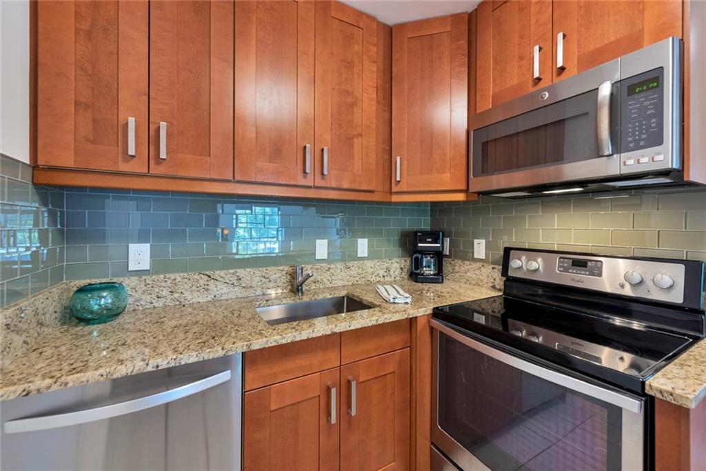 Strikingly handsome & roomy 2bed 1.5 bath corner unit on second floor. Renovated kitchen w/ granite counter tops, new stove, microwave & dishwasher plus new cabinets too! Renovated full bath with vanity and shower/tub plus ADA height toilet. Reno'd half bath also with ADA toilet. Popcorn ceilings smoothed! AC & Water heater 2014 new. NEW ceiling fans in all rooms. NEW six panel doors. Custom closet in master and custum enlarged storage closet. Oversized combo washer/dryer. Truly a wonderful opportunity.