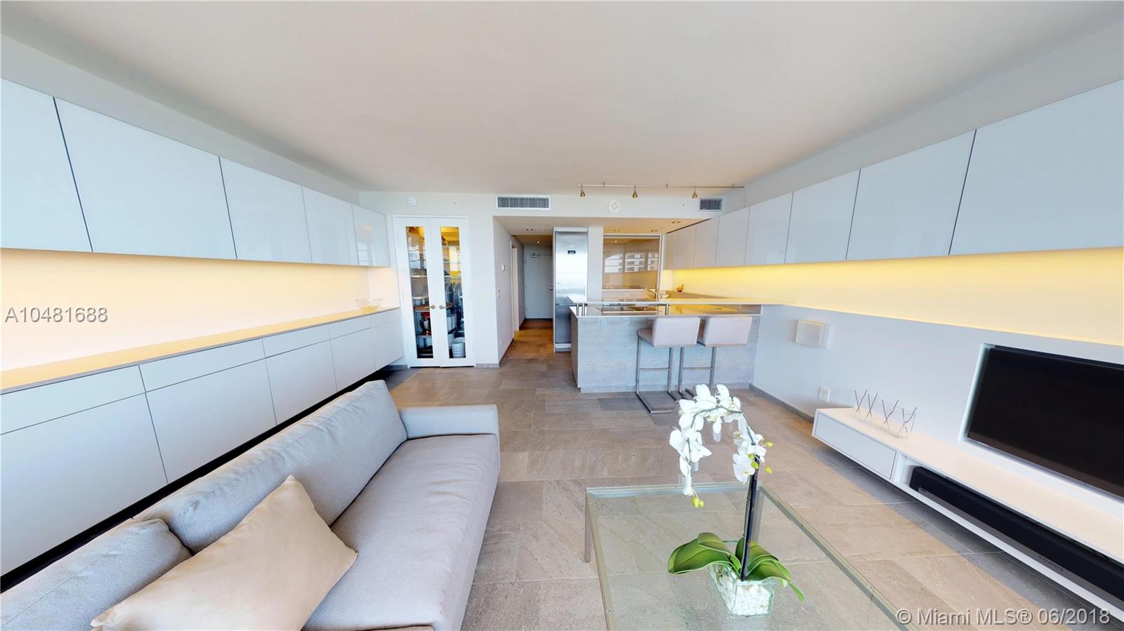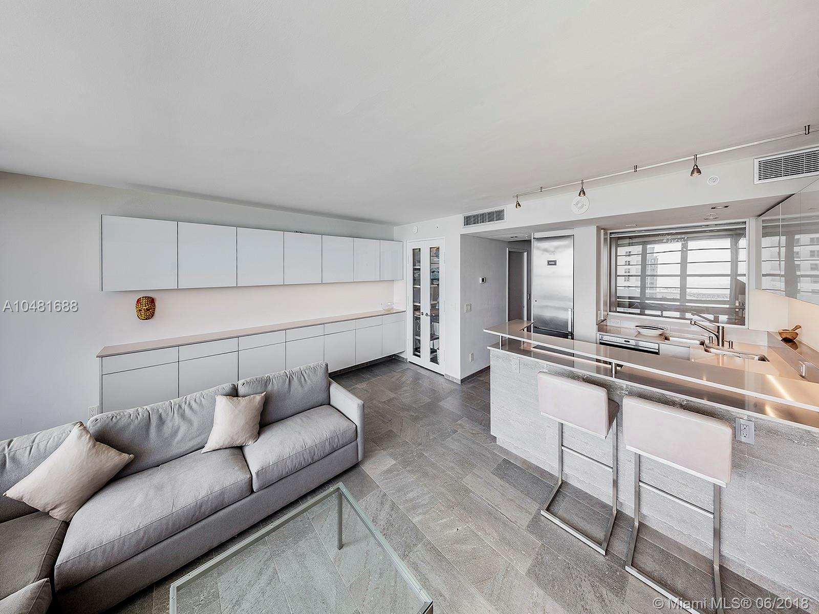 ONE OF A KIND! Brilliantly designed Jr 1 Bdrm and a perfect residence for the Buyer who appreciates quality and custom finishes. Gut renovation with wood cabinetry and glass doors, Italian porcelain tile, Quartz counter tops, top of the line (Bosch & Wolf) appliances, and impact windows and door. Premier "36" line with balcony and the most desirable Southern exposure offering ocean, coastline, and Downtown Miami views. One assigned parking space.