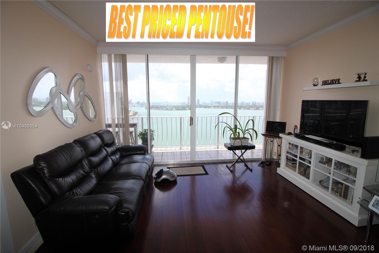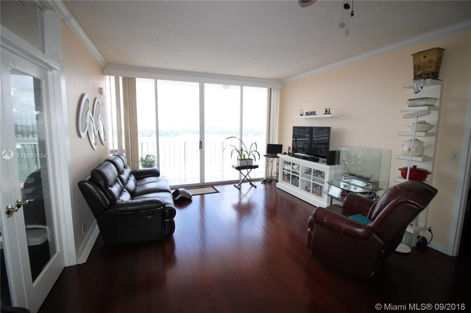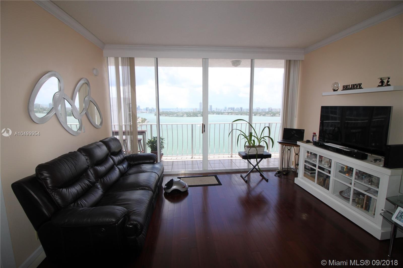 LOWEST PRICED PENTHOUSE! Fantastic view to the Biscayne Bay and the Atlantic Ocean from this top floor penthouse in trendy North Bay Village. Split bedroom floor plan with Cherry Hardwood floors. Kitchen, bath and hallway have tile floors. Floor to ceiling windows! Complex is very secure and has a fantastic huge swimming pool. Walk to restaurants and nearby shops. Building has a gym, convenience store and many other commercial offerings on the ground floor. Unit has one covered inside parking spot. North Bay village is about 6 miles from South Beach or Downtown Miami. Furniture available to purchase.