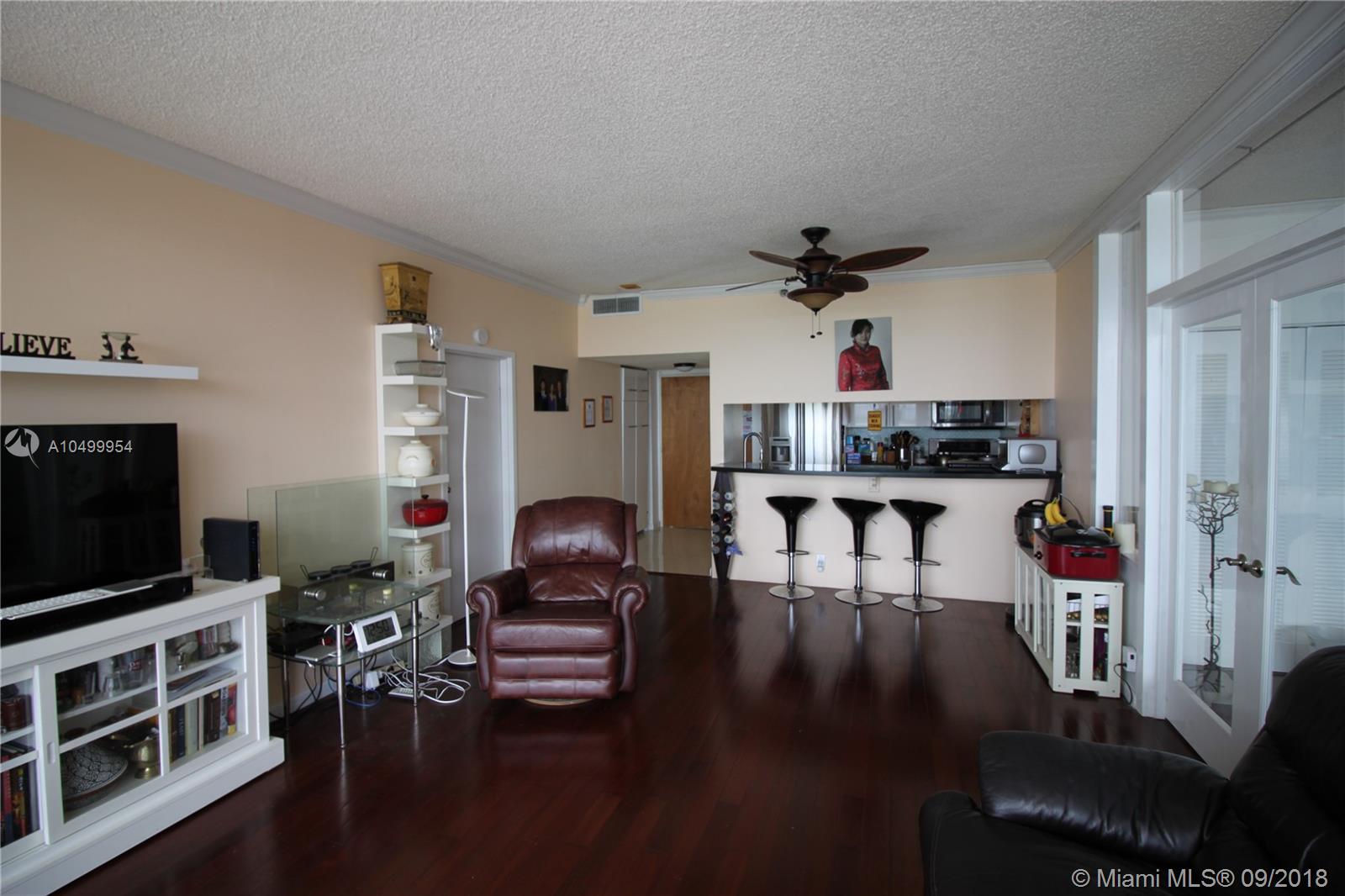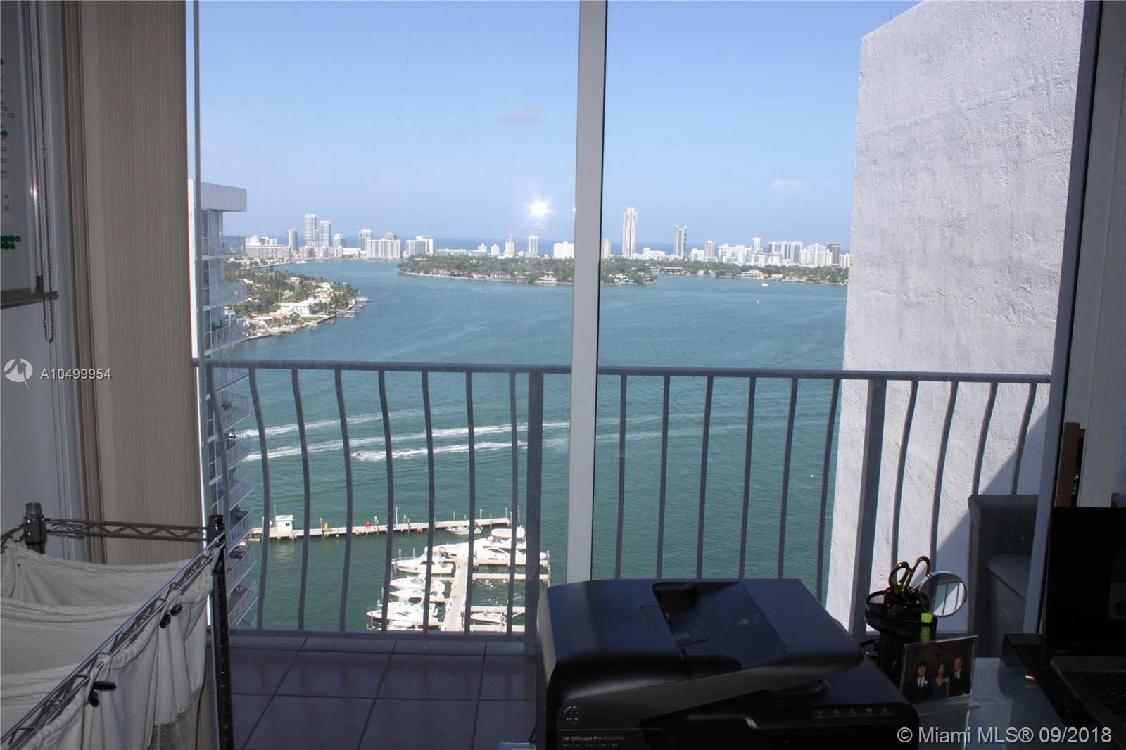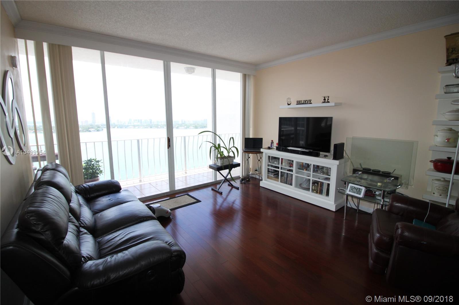LOWEST PRICED PENTHOUSE! Fantastic view to the Biscayne Bay and the Atlantic Ocean from this top floor penthouse in trendy North Bay Village. Split bedroom floor plan with Cherry Hardwood floors. Kitchen, bath and hallway have tile floors. Floor to ceiling windows! Complex is very secure and has a fantastic huge swimming pool. Walk to restaurants and nearby shops. Building has a gym, convenience store and many other commercial offerings on the ground floor. Unit has one covered inside parking spot. North Bay village is about 6 miles from South Beach or Downtown Miami. Furniture available to purchase.