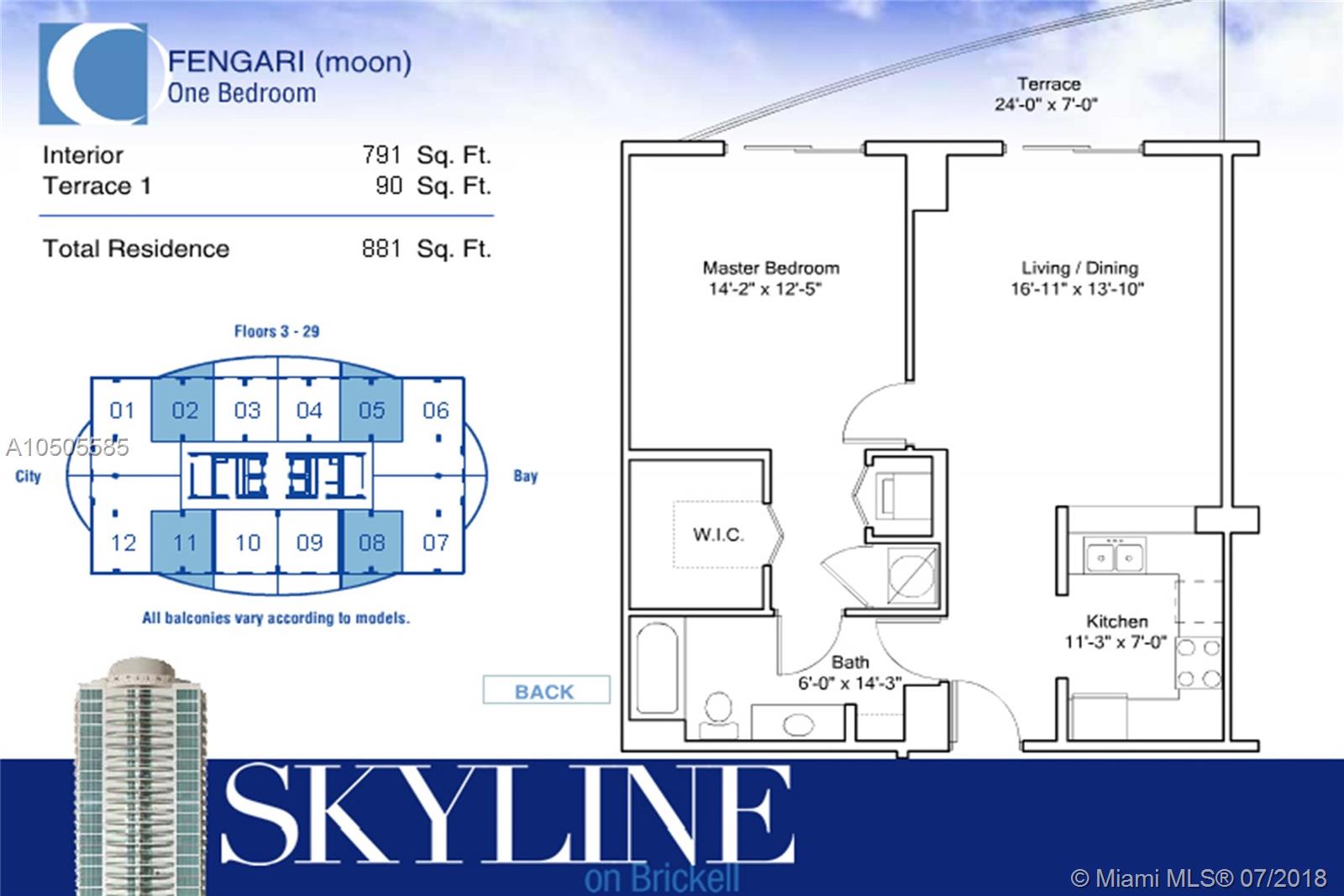 1 Bed/1 Bath north-facing unit at Skyline on Brickell situated along Biscayne Bay in South Brickell offering an expansive terrace featuring exceptional bay and city views. 791 SF of interior living space offering marble flooring throughout, floor-to-ceiling hurricane-impact windows/sliding glass doors, spacious kitchen with granite countertops, wood cabinetry and stainless-steel appliances, large private bedroom with walk-in closet and bathroom featuring bathtub/shower combination with marble wet walls. This unit also includes an in-unit washer/dryer and 1 assigned parking space. Luxury amenities include 24-hr security, concierge services, bayfront swimming pool, jacuzzi, marina, fitness center, lighted tennis court, sand volleyball, kid’s park and BBQ area.