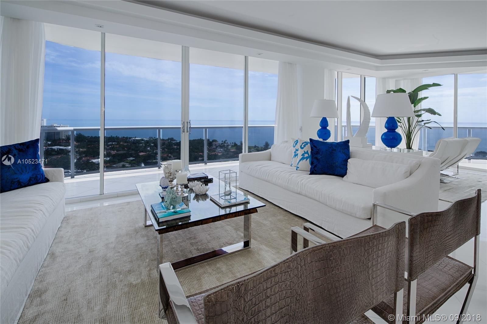 Highly sought after two bedroom PLUS DEN (which may be closed for third bedroom)Biscayne Model apartment. Floor plan attached. Interior features include private elevator entry along with spectacular views of the ocean, intracoastal and Golden Beach from every room. Offered fully furnished turn key if desired-negotiable. Contemporary furnishings from Artefacto along with beautiful white marble floors, motorized shades and drapery, LED lights, new plumbing fixtures, new carpeting in bedrooms, closet interiors, and new A/C. Additional walk in closet in master bathroom. Easy to show and sell!