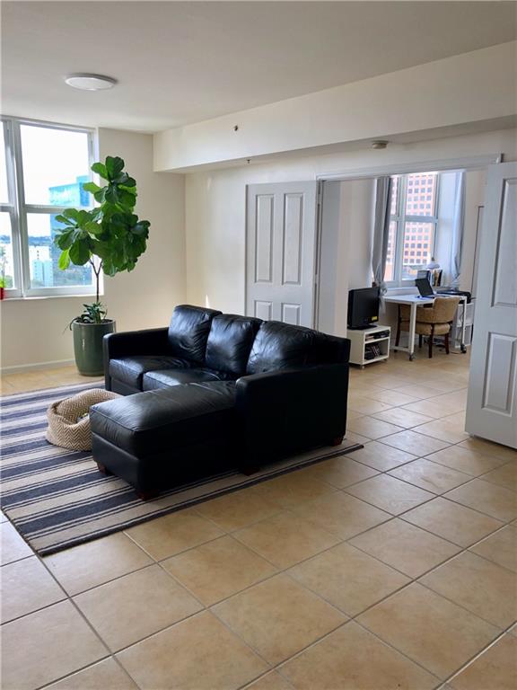One bedroom plus a den in highly sought after NuRiver Landing. High floor residence has over 1,000 Sq. Ft. of bright and open living space. Stainless appliances, tile flooring, carpet in bedroom, move in ready. Resort style amenities include a roof top pool, fitness center and a penthouse clubroom. Open balcony with sweeping views of the city all the way to the Ocean. 2nd bedroom does not have a closet.