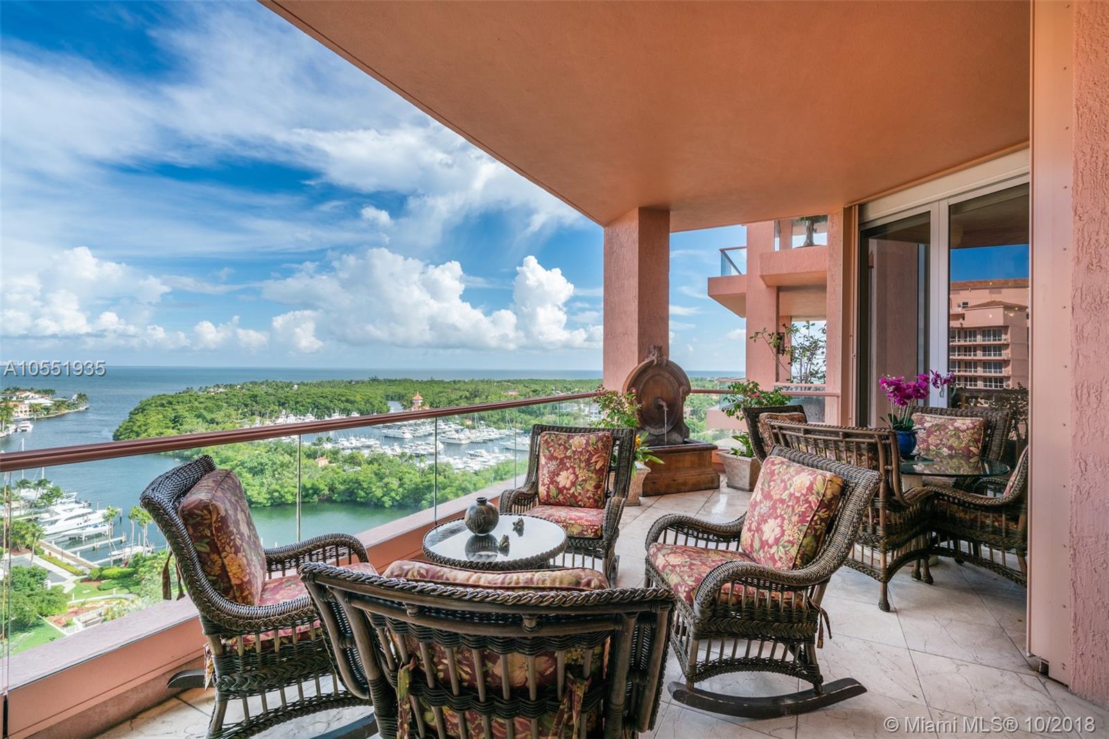 Remarkable Penthouse unit on the 15th Floor at The Gables Club. Breathtaking eastward views of Downtown Miami, Cocoplum Marina and Biscayne Bay, one of the best in the building! Spacious open floor plan with Great Room featuring a built-in bar, marble floors, impact picture windows with sliding doors to oversized balcony. Enjoy your morning coffee or mid-day meals with with a view in the kitchen with breakfast nook that maximizes the outstanding views of this one-of-a-kind penthouse. First-Class Building amenities include full-service Restaurant & Bar, Salon, Spa, Putting Green, 2 Pools, Sauna, Hot Tub, 24-hour concierge, Valet, Gated entry to grounds. This unit comes with 2 parking spaces and storage unit. The 3rd bedroom is currently being used as a Den.