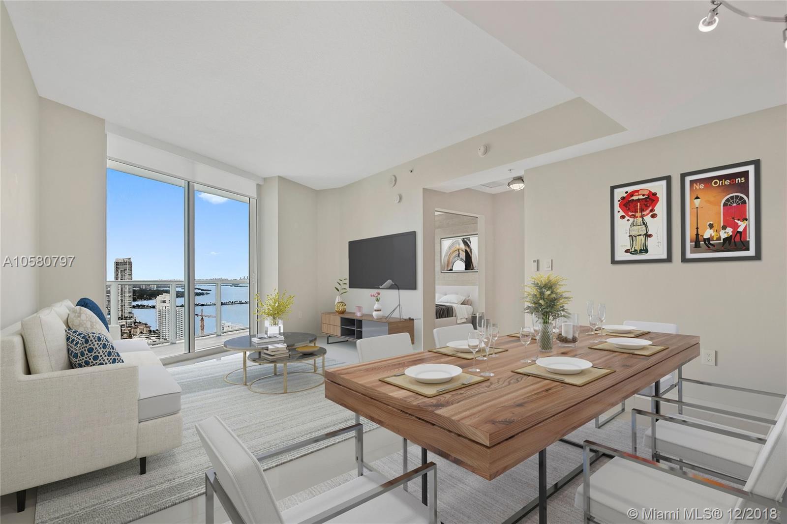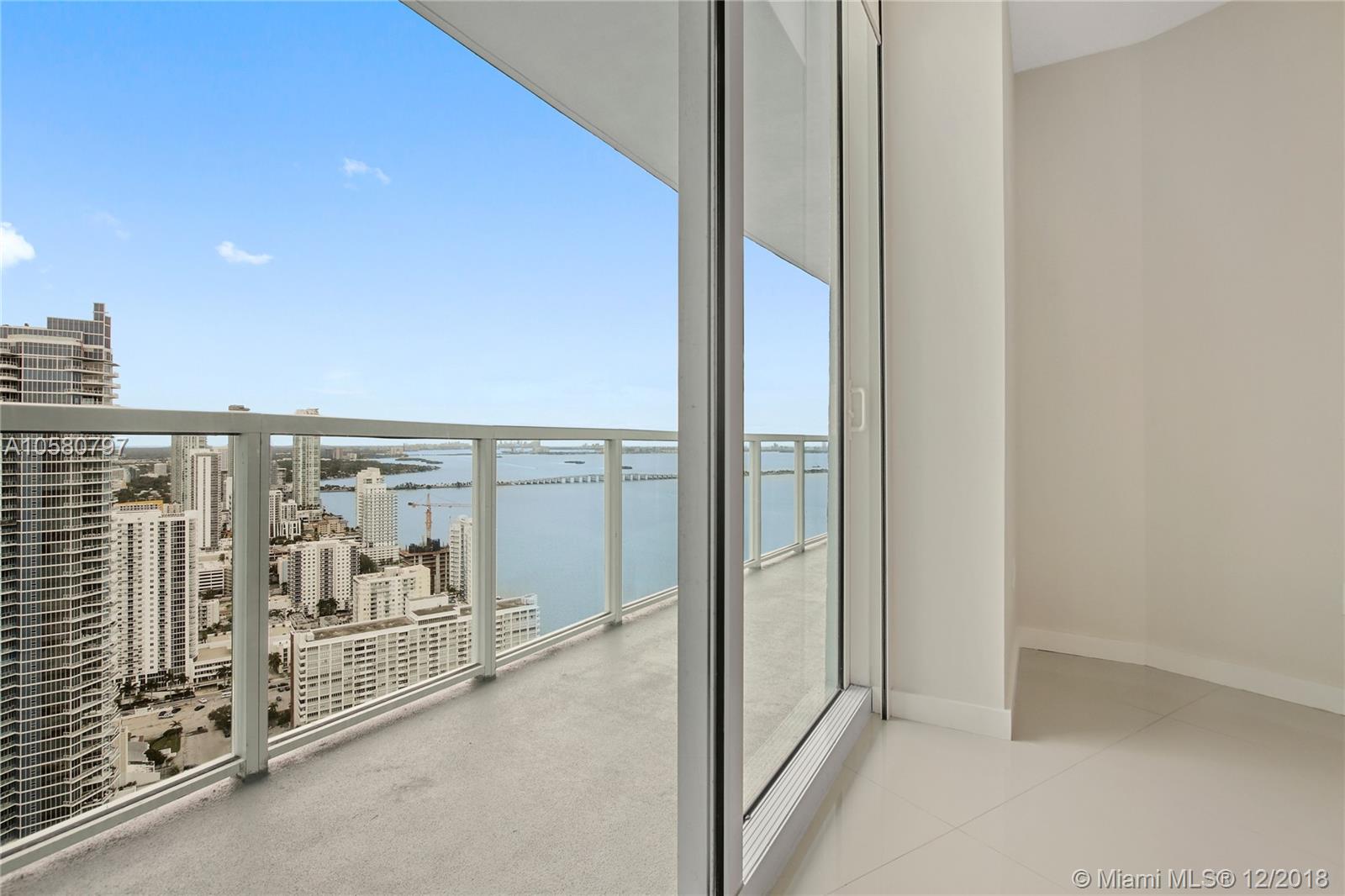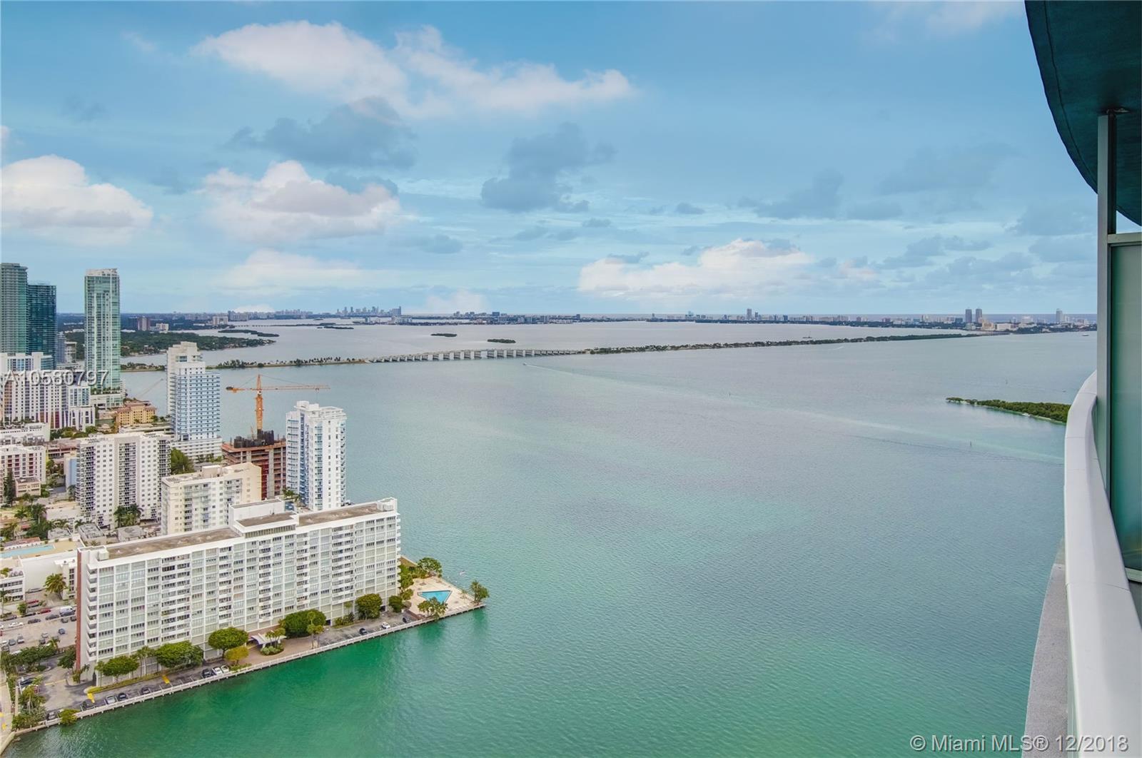 Rarely available, fully remodeled large 1bdrm + large den that can easily be converted into another bdrm or office. This unit is on the 42nd floor with stunning unobstructed views of Biscayne Bay and Miami Beach. The unit boasts of high end porcelain flooring and a remodeled Kitchen island extended with stone counter tops along with Cabinetry to the ceiling, providing additional storage space. The kitchen also has extebded white quarts countertops, high end sliding barn doors and motorized window treatments and a new front end washer and dryer. Luxury amenities include: 24h concierge, valet, convenience store, spa/hair salon, pool, jacuzzi, fitness center, saunas, movie theater and more. Short drive to Brickell, Wynwood, Design District shops and South Beach. Call today, easy to show.