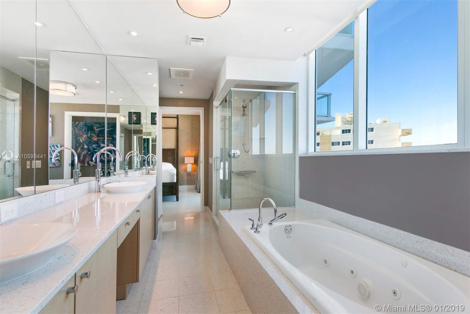 Elegant flow through unit with direct ocean views to the east and vibrant city views to the west. Beautifully finished and furnished turn-key ocean front condo at the elegant Mosaic. Private elevator, open floor plan, Poggenpohl kitchen, luxurious bathrooms and 2 large terraces offering direct ocean sunrise views and dramatic sunset views. Amenities include European edge pool overlooking the ocean, Beach service, fitness center, spa, club room, media room, business center, sculpture garden, doorman and valet parking. Ideal beach front location adjacent to the cultural Faena district offering a unique lifestyle of leisure and comfort.