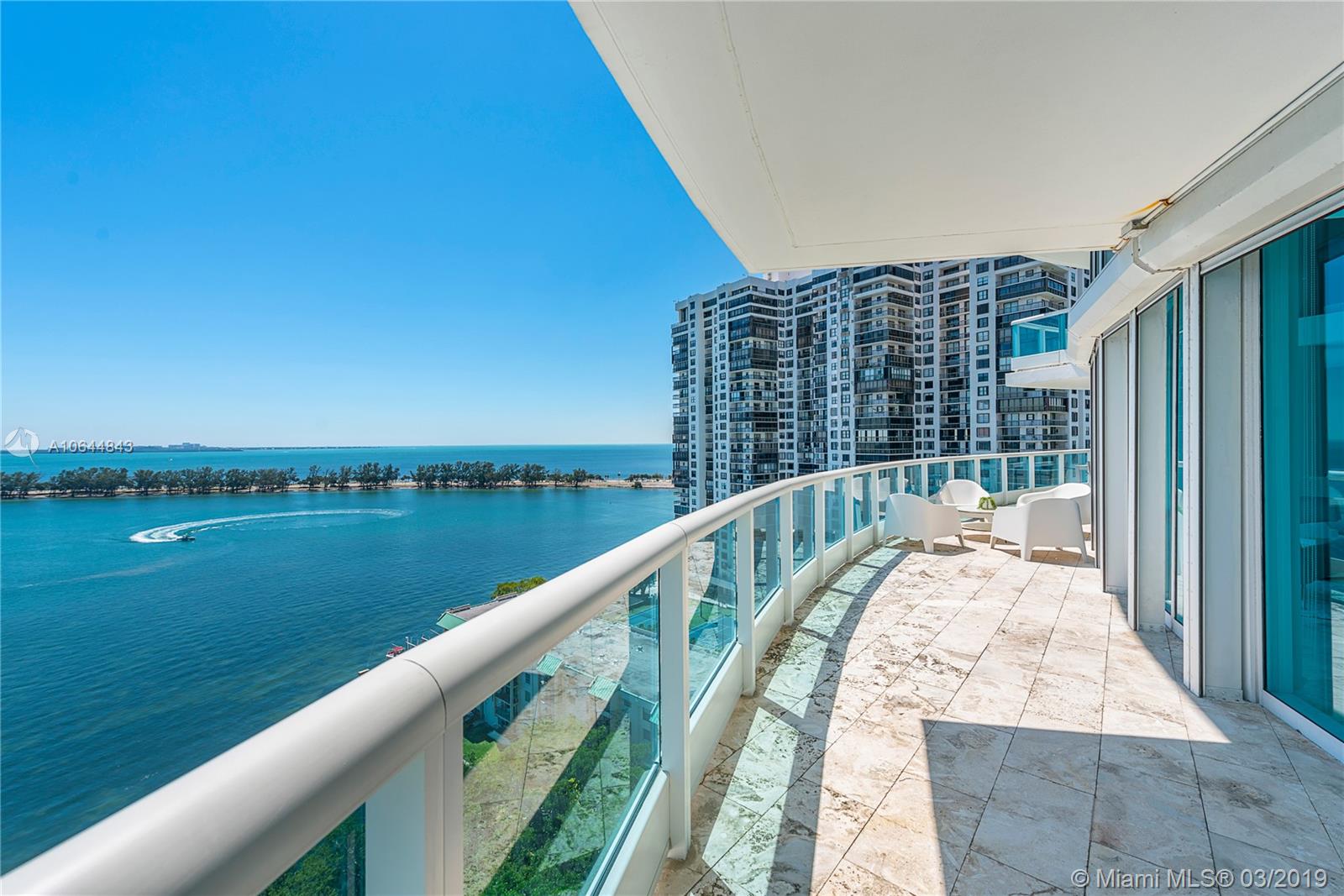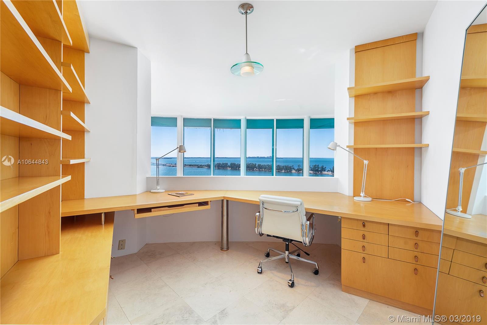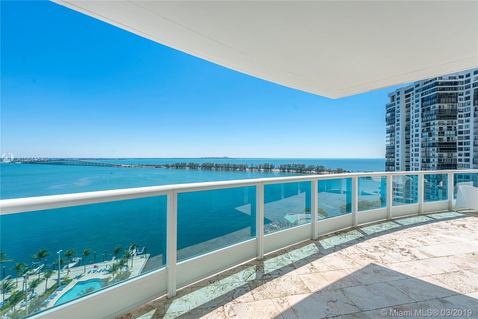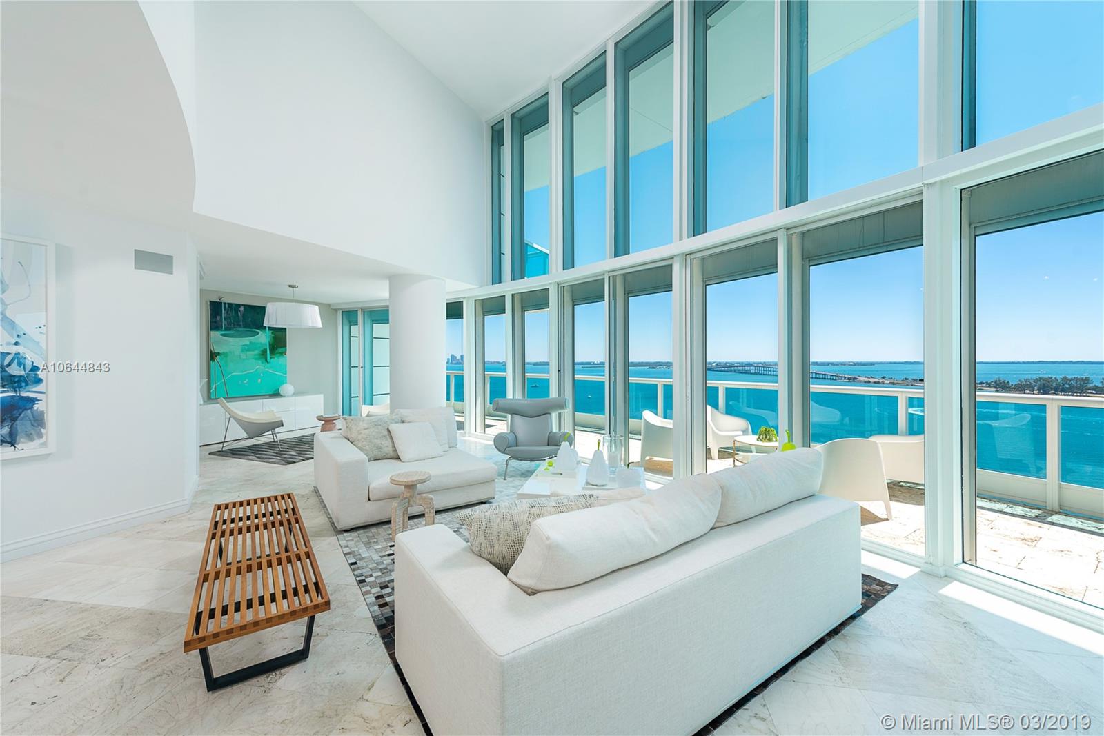 Distinguished Full Service Ugo Columbo building. Highest floor all waterfront Townhome (floors 18/19th ) double height 50 ft wide great room w/floor to ceiling windows (approx. 18' Ht), & panoramic views of Biscayne Bay /Ocean from all rooms. approx 2700 sf interior plus approx 700 sf waterfront wrapped terraces from all principle rooms. 2 Bedroom Suites & Office & Den. 3Ba & Powder room. Stone main floor w/ gracious foyer & wide stone stair to upstairs. Master w/ own terrace, two WIC, two baths & linen. Guest with Bth, own terrace, WIC and 2 linens. Ample storage throughout. 3 parking spaces, Concierge, Tennis, fitness, coffee shop. Kitchen w/ New stainless appliances. Laundry room. Millionaires mile location close to upscale shops & dining, I-95 & KB.