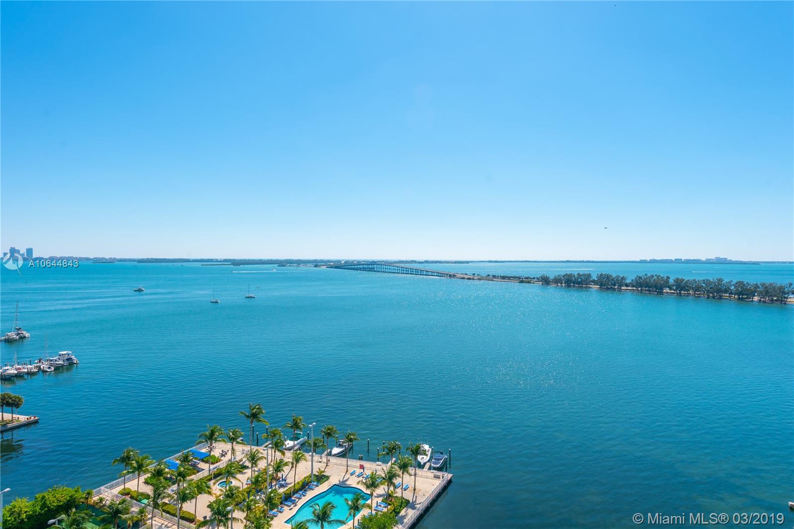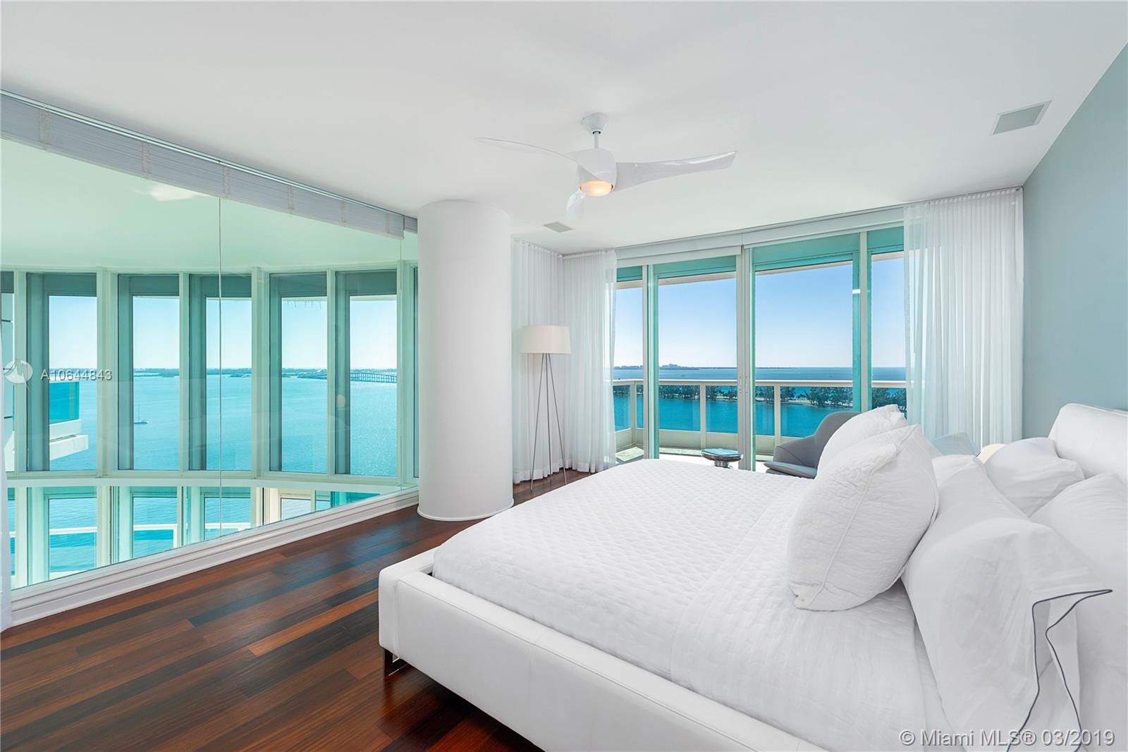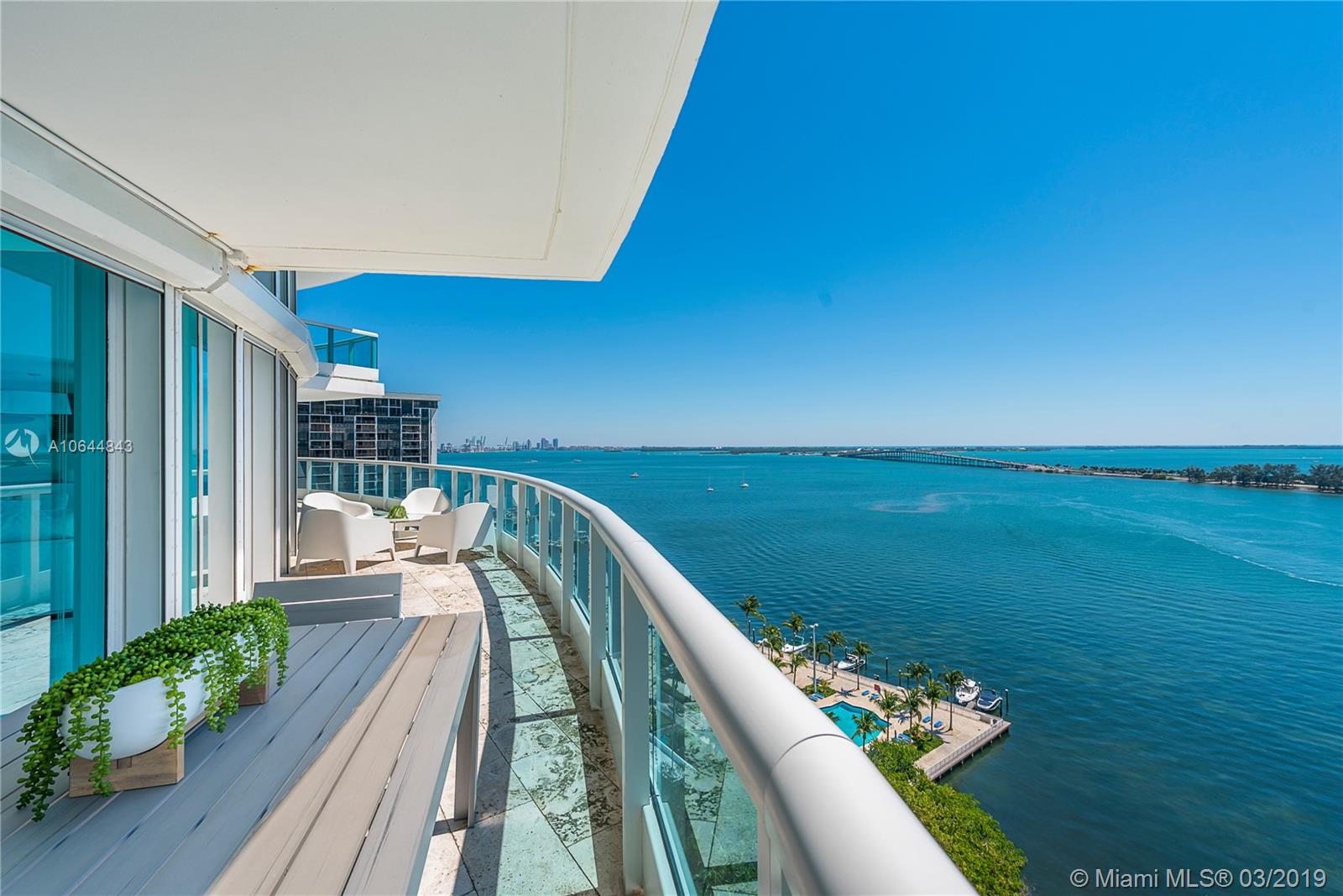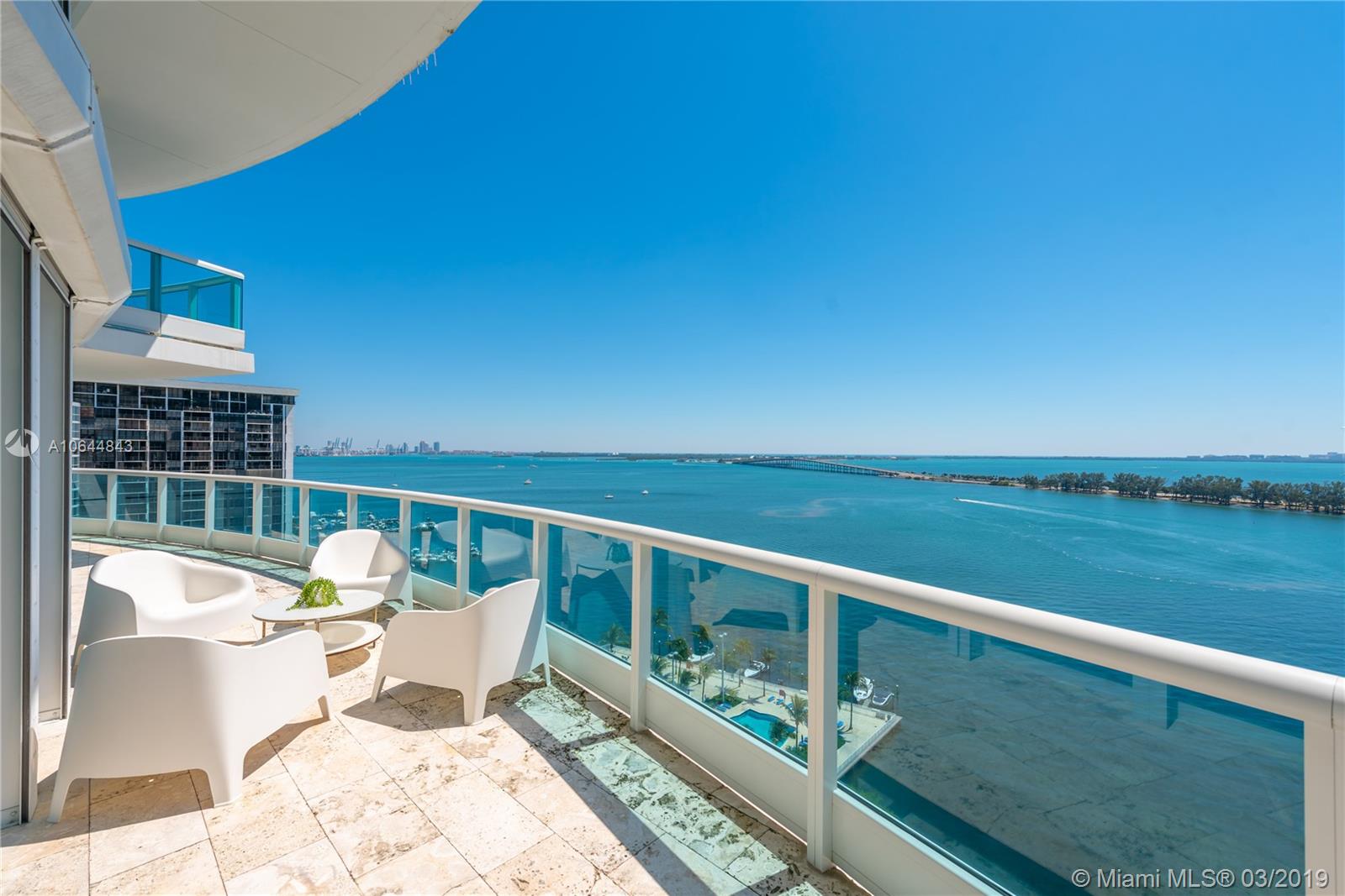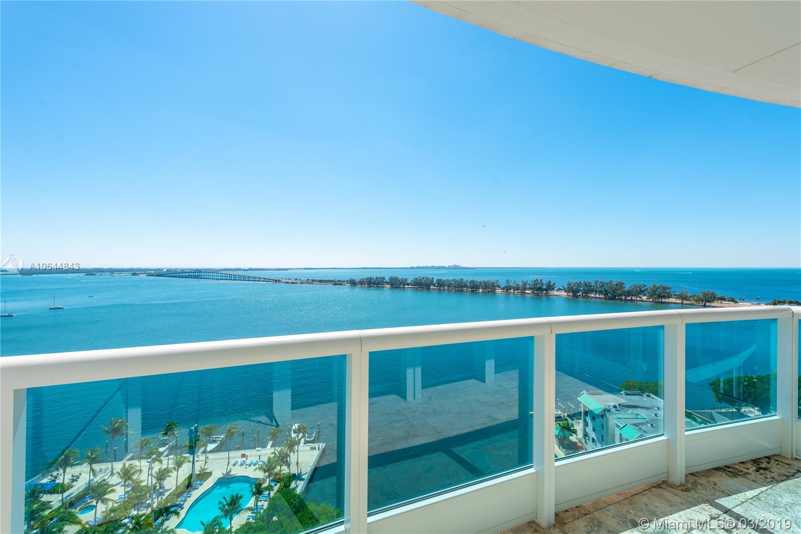Distinguished Full Service Ugo Columbo building. Highest floor all waterfront Townhome (floors 18/19th ) double height 50 ft wide great room w/floor to ceiling windows (approx. 18' Ht), & panoramic views of Biscayne Bay /Ocean from all rooms. approx 2700 sf interior plus approx 700 sf waterfront wrapped terraces from all principle rooms. 2 Bedroom Suites & Office & Den. 3Ba & Powder room. Stone main floor w/ gracious foyer & wide stone stair to upstairs. Master w/ own terrace, two WIC, two baths & linen. Guest with Bth, own terrace, WIC and 2 linens. Ample storage throughout. 3 parking spaces, Concierge, Tennis, fitness, coffee shop. Kitchen w/ New stainless appliances. Laundry room. Millionaires mile location close to upscale shops & dining, I-95 & KB.