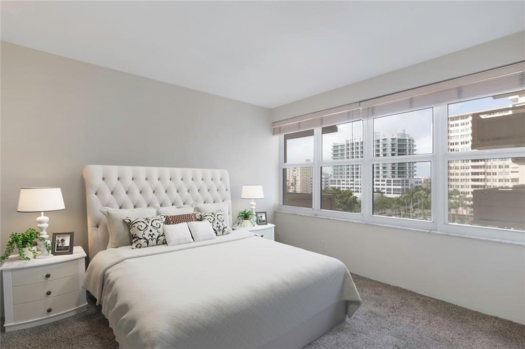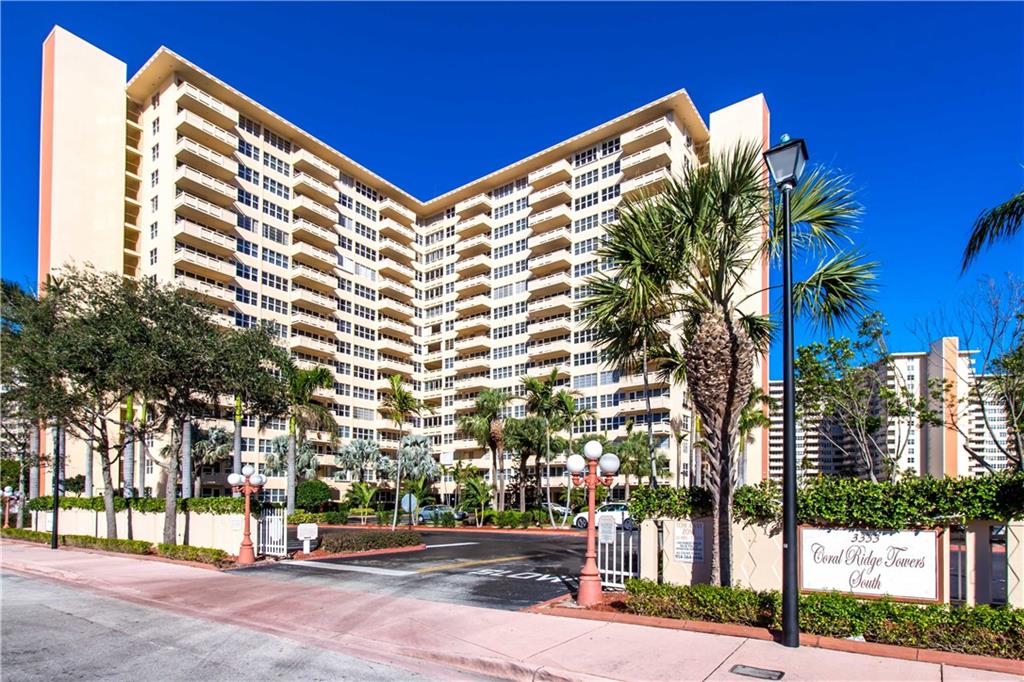 Largest two bedroom floor plan in the Coral Ridge Towers complex with lovely views of the pool, garden, and surrounding neighborhood. Updated and sophisticated with 1500 sq ft of living space and a split bedroom floor plan for privacy when entertaining guests. Remodeled kitchen, updated bathrooms, NEW AC, NEW Hot Water Heater, upgraded electrical, porcelain tile floors and hurricane impact windows/door installed. Extra large 13 x 12 Florida Room overlooking the pool and garden, great for relaxing and entertaining! Located on a barrier island between the Ocean and Intracoastal, Coral Ridge Towers is a fantastic place to live. Association states one buyer must be 55 plus. No Pets & No Rentals.