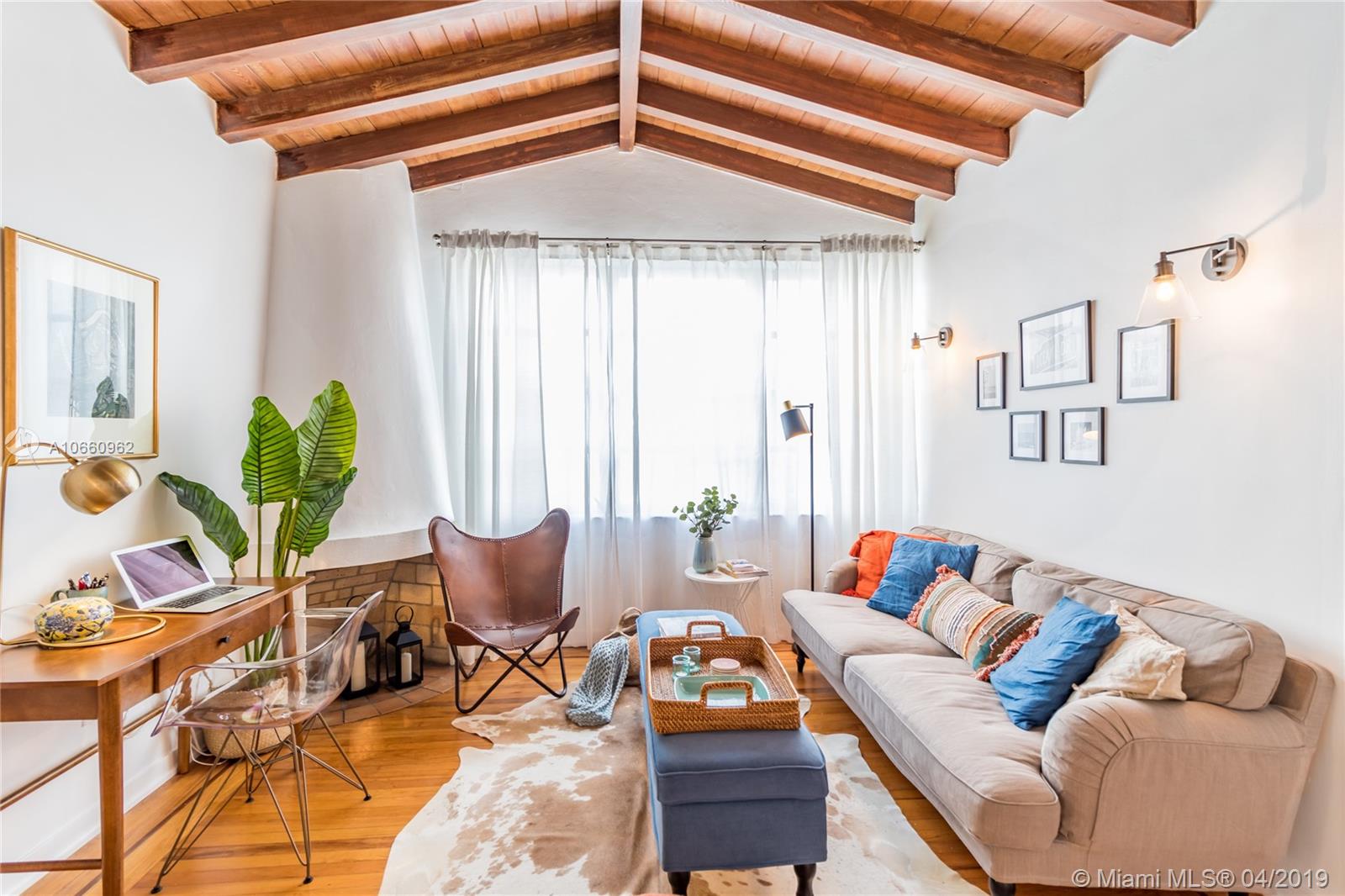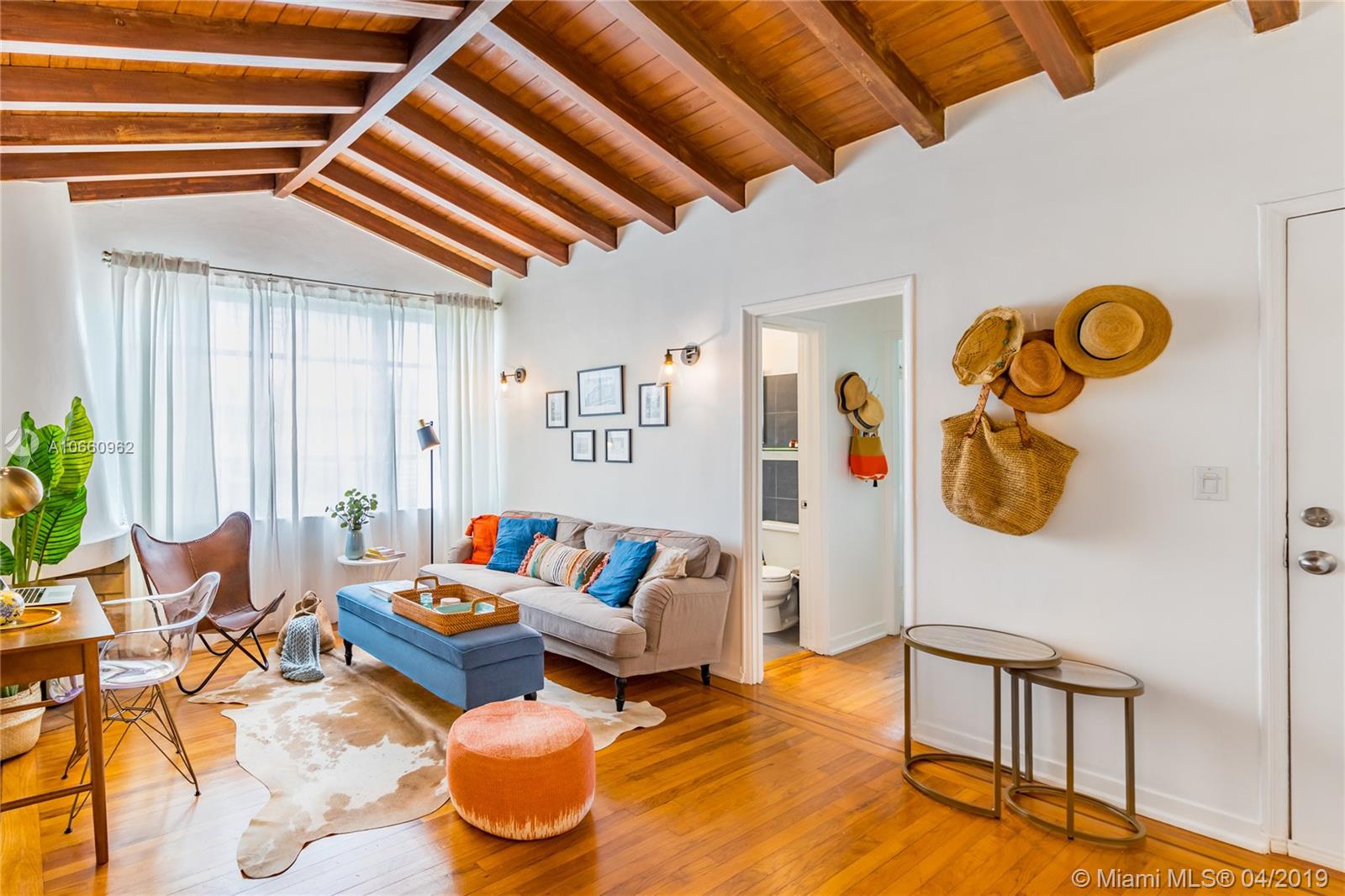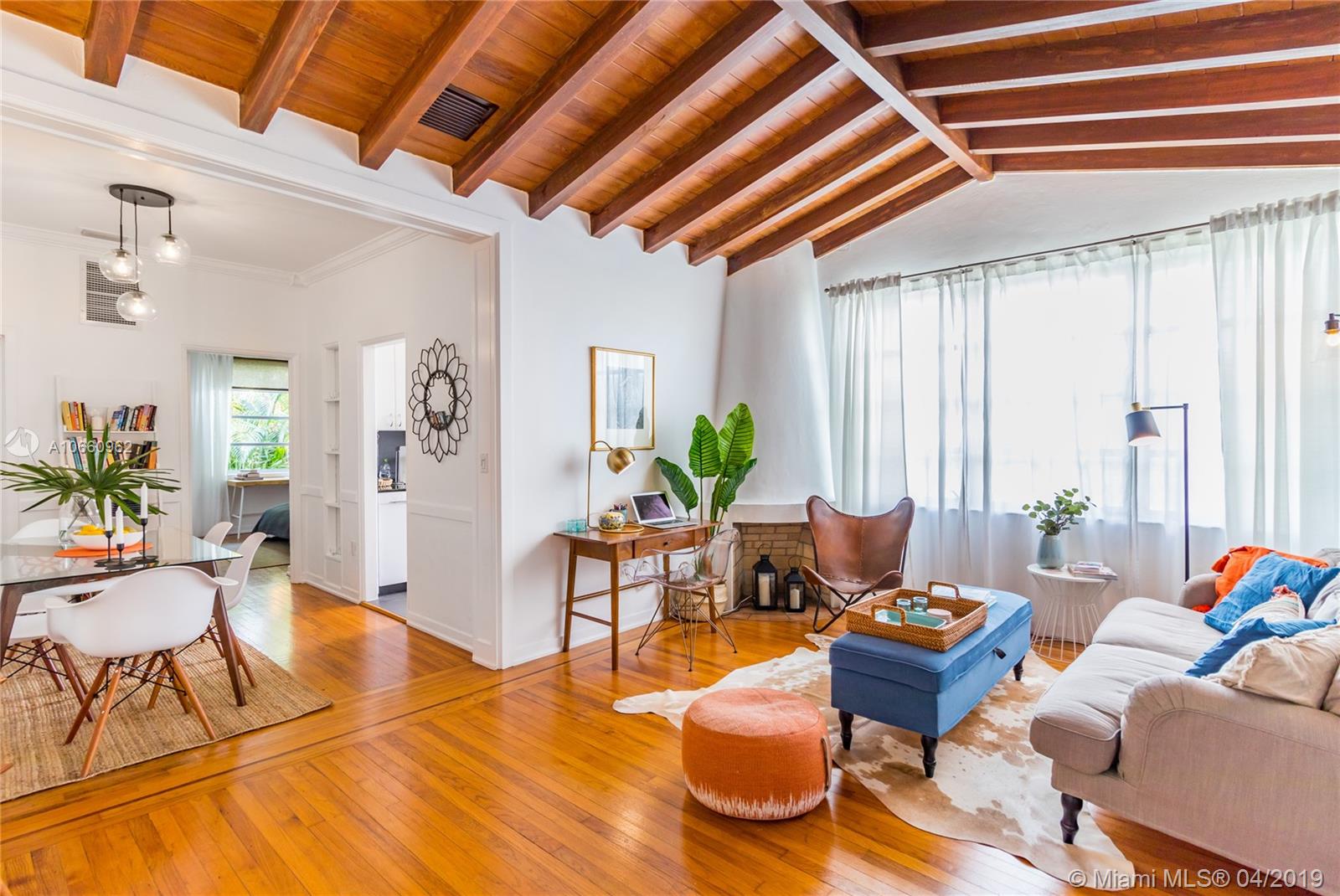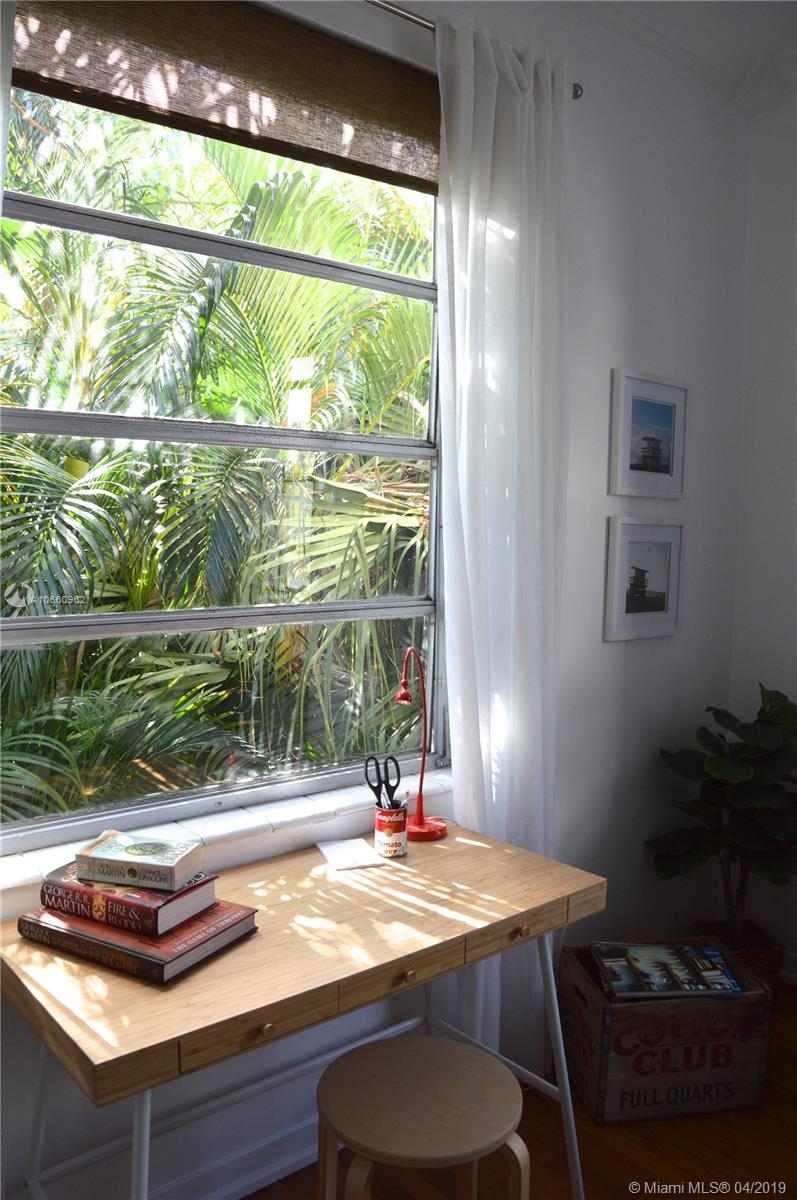 Tranquil and bright historic home perfect for South Beach living. This spacious 2/2 boasts three exposures, a dramatic vaulted ceiling with incredible exposed beams, deco fireplace, bright kitchen with granite counters and updated appliances, full size front loading washer/dryer, modern baths with glass shower enclosures and functional split floorplan with allowing privacy for each bedroom. This turn-key beautifully furnished residence includes its own private garage with plenty of room for your car plus additional storage. Lovely common gardens include a very private seating/dining area in a lush tropical setting. Walking distance to shops, Lincoln Rd, Flamingo Park and the beach make this the perfect home.