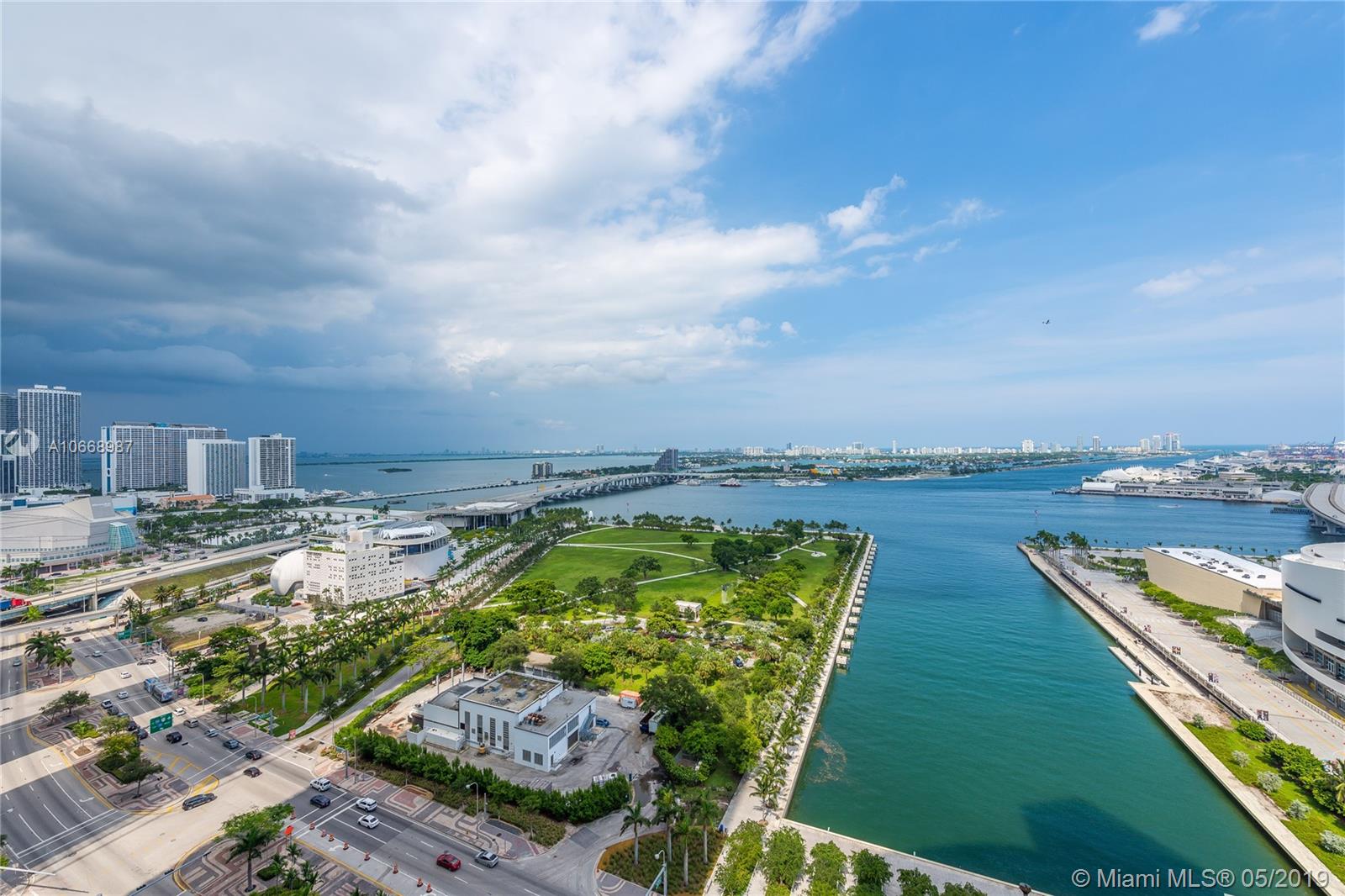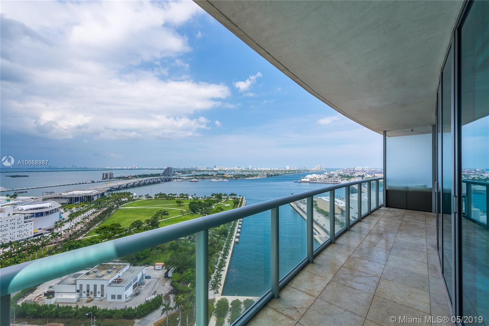 Incredible bay & ocean views from this spacious 2 Bed/2 Bath located directly in front of the American Airlines Arena & Museum Park. This beautiful 1,318 interior square feet downtown condo features sunrise and sunset balconies, stainless steel appliances, washer/dryer, tiled flooring throughout, and walk-in closets in each bedroom. Includes 1 assigned parking space + storage. Building approved for 5% Down