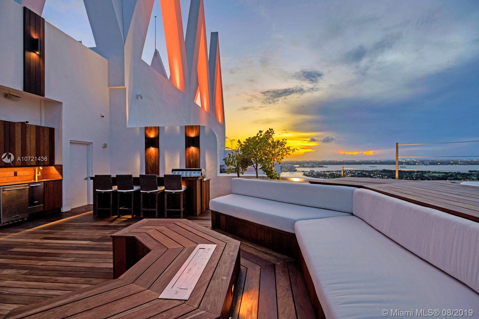 One of a kind Trophy Property ! This Tri-Level Sky Villa is the highest residential existing Penthouse in Miami Beach. This dreamy corner Penthouse has 3 Large Bedrooms and 3.5 baths with panoramic views of the Ocean, Biscayne Bay, Indian Creek and the Miami Skyline from every room along with close to 3000 sqft of outdoor space and a brand new rooftop private pool deck and inspired from The Setai. It is turnkey for a lucky buyer w/ summer kitchen & 3 balconies and high end details such as quartz floors, Venetian plaster walls, Roche Bobois furniture, Smart home, SONOS, leather doors and built-in beds. 4 Deeded parking spaces at lobby level . Low HOA for such a property. All common areas of AKOYA to be luxuriously upgraded ( pics on MLS) fully paid off. One in a lifetime opportunity