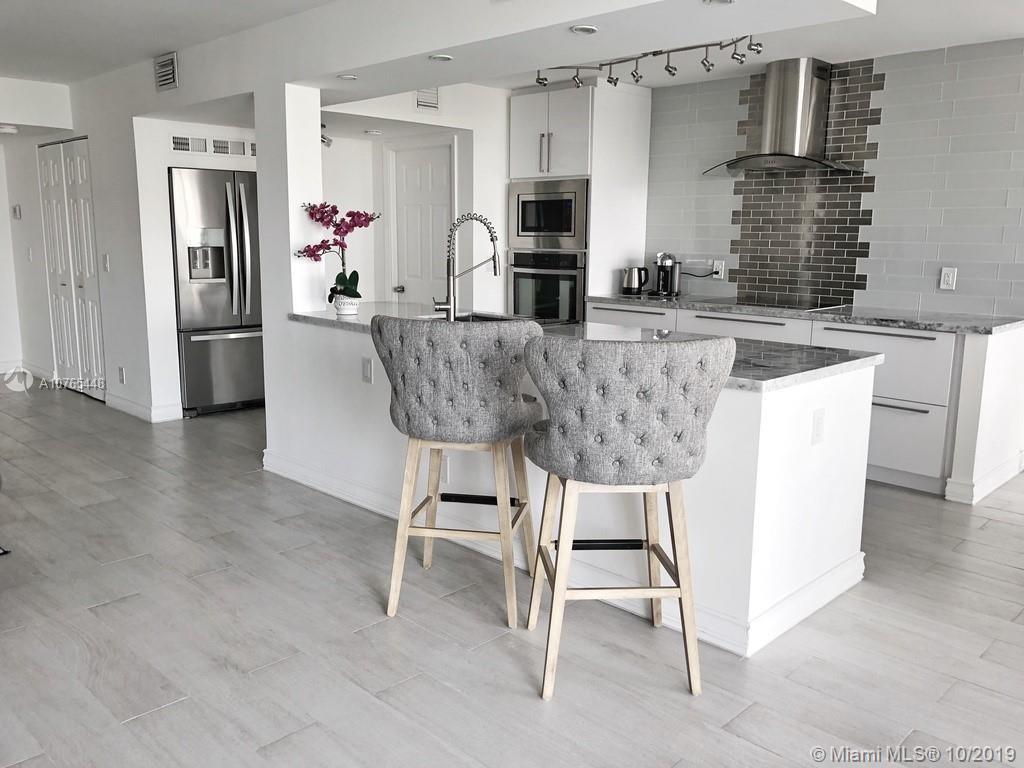 Totally remodeled apartment with spacious open floor plan (1 bedroom & a den). Everything was redone with top quality materials : grey porcelain tiles throughout the entire unit, wide open kitchen with marble counter top, white cabinets, stainless steel appliances and double sink vanity in the master bathroom. Bedroom has a dream walk in closet and office space. New A/C & water heater. All windows have amazing water view. Security 24/7, gym, heated pool. Close to the beach & supermarkets.