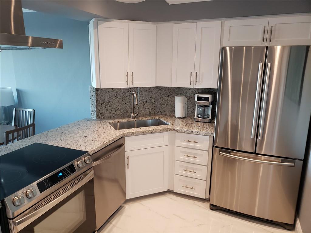JUST REMODELED SHOWCASE UNIT FULLY FURNISHED, NEW 24X24 PORCELAIN TILE,CROWN AND BASE MOLDING THROUGHOUT. OPEN SPACIOUS DESIGNER KITCHEN W/NEW PLUMBING AND HIGH END STAINLESS STEEL APPLIANCES, NEW CABINETS, GRANITE COUNTER TOPS AND BACK SPLASHES. CHEFS VENTED HOOD IS CONNECTED TO OUTSIDE. THE BATHROOM FEATURES ALL NEW PLUMBING, NEW WATER MAIN SHUT OFF VALVE FOR THE ENTIRE UNIT, PER BUILDING RULE. HURRICANE WINDOWS & DOOR. GREAT WALK-IN SHOWER HAS CUSTOM FRAME LESS GLASS DOORS. NEW COMFORT HEIGHT COMMODE AND VANITY. NEW HOT WATER HEATER, CUSTOM LOUVERED DOORS FOR EASY ACCESS TO A/C & HOT WATER HEATER. ALL RENOVATIONS COMPLETED W/BUILDING APPROVAL AND CITY PERMITS. WALK TO COMMUNITY ACTIVITY CENTER, BEACH, BANKS, RESTAURANTS, SHOPPING. FREE SHUTTLE TO MALL & HOSPITAL. BLDG HAS CENTRAL A/C