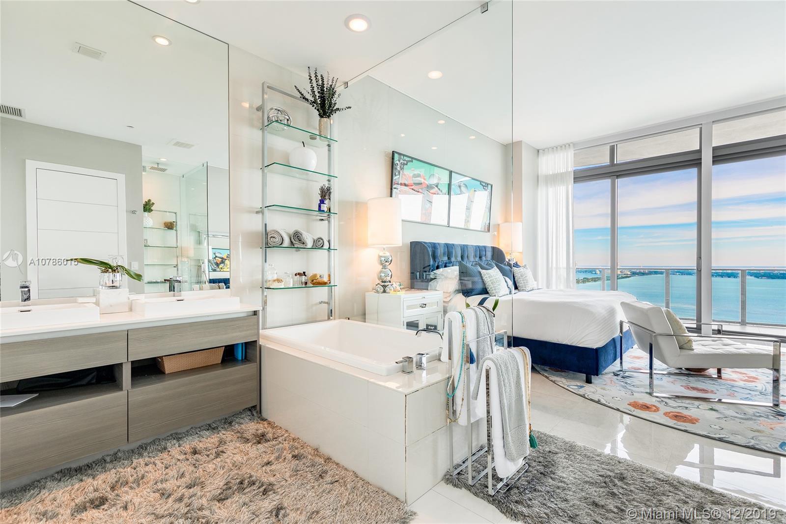 Stunning contemporary 4BRs plus maid's/4 BAs PENTHOUSE on the 40th floor at Icon Bay in Edgewater. Private elevator opens up to your residence with direct unobstructed bay and ocean views. No expense was spared as every detail was professionally designed, custom 8' Wenge Euro doors, Lutron lighting fixtures in LR, DR and Kitchen. +/-11' ceilings, Dove Grey porcelain tile floors throughout, large master suite with direct water views, open Oak kitchen with Monogram appliances & quartz countertops, NEST system. Incredible sunsets & sunrises. Bldg. amenities: bayfront pool, movie theater, tennis ct, state-of-the-art fitness center, spa, sauna, massage area, concierge services, valet parking, 24/7 security & more. Located just minutes away to Midtown, Wynwood, Design District, Brickell & SOBE.