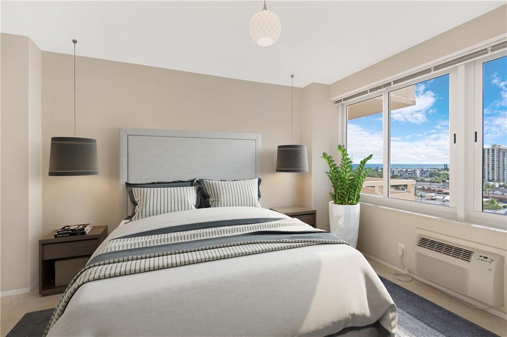 The view will knock your socks off! Don't miss the best location in Coral Ridge Towers with sweeping views of the ocean and intracoastal. This beautifully updated apartment is move in ready. Features a brand new Freidrich air conditioner, porcelain tile floors, hurricane impact windows and French door. Low monthly maintenance includes cable TV. This building is financially secure, well-run, and has a full-time on-site manager. 3 blocks to the ocean, water taxi at your back door, and a heated pool directly on the intracoastal. You will love living here.