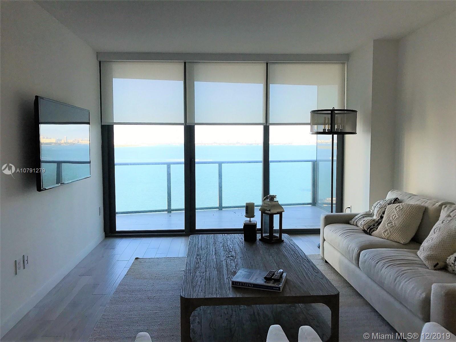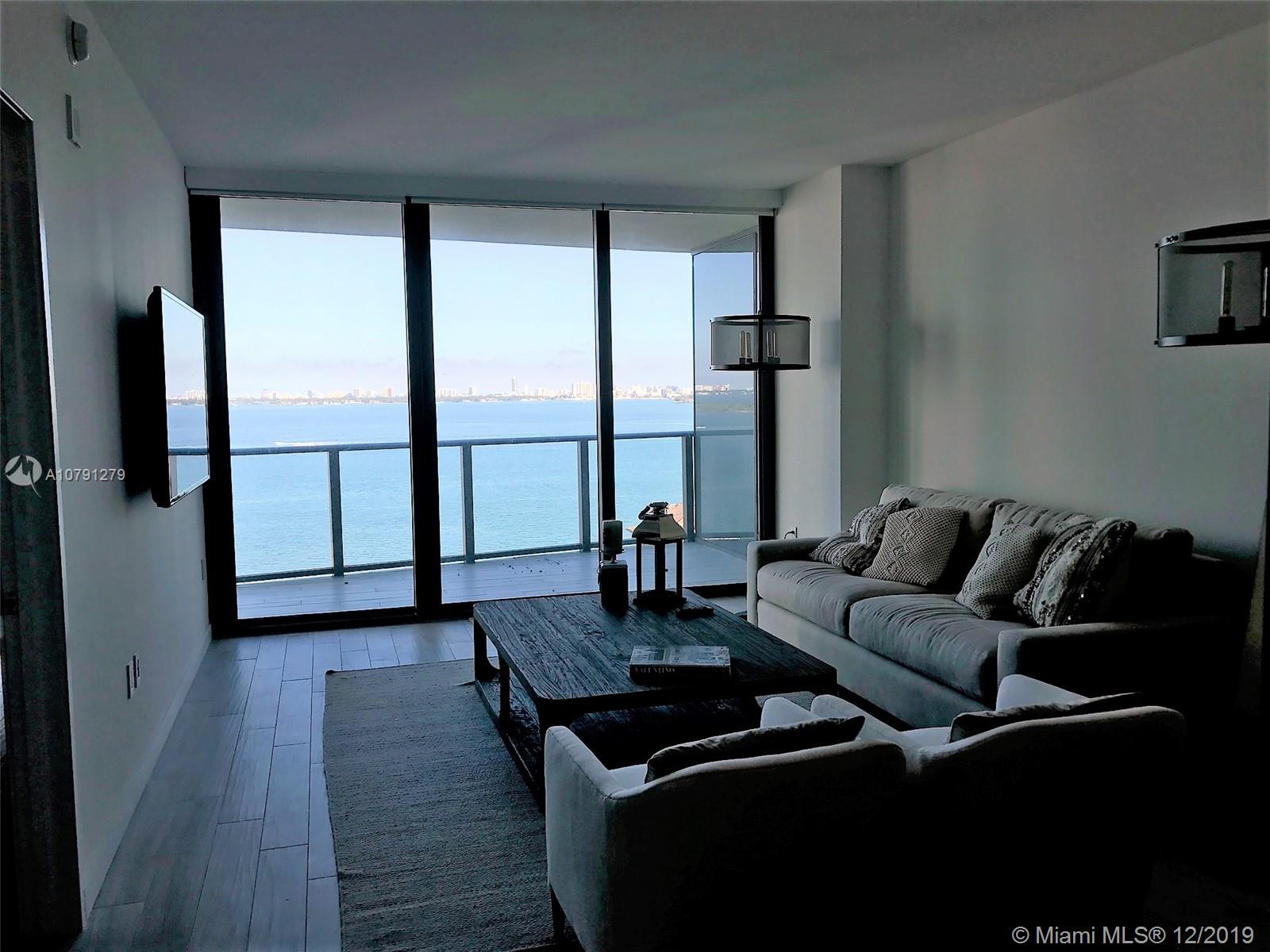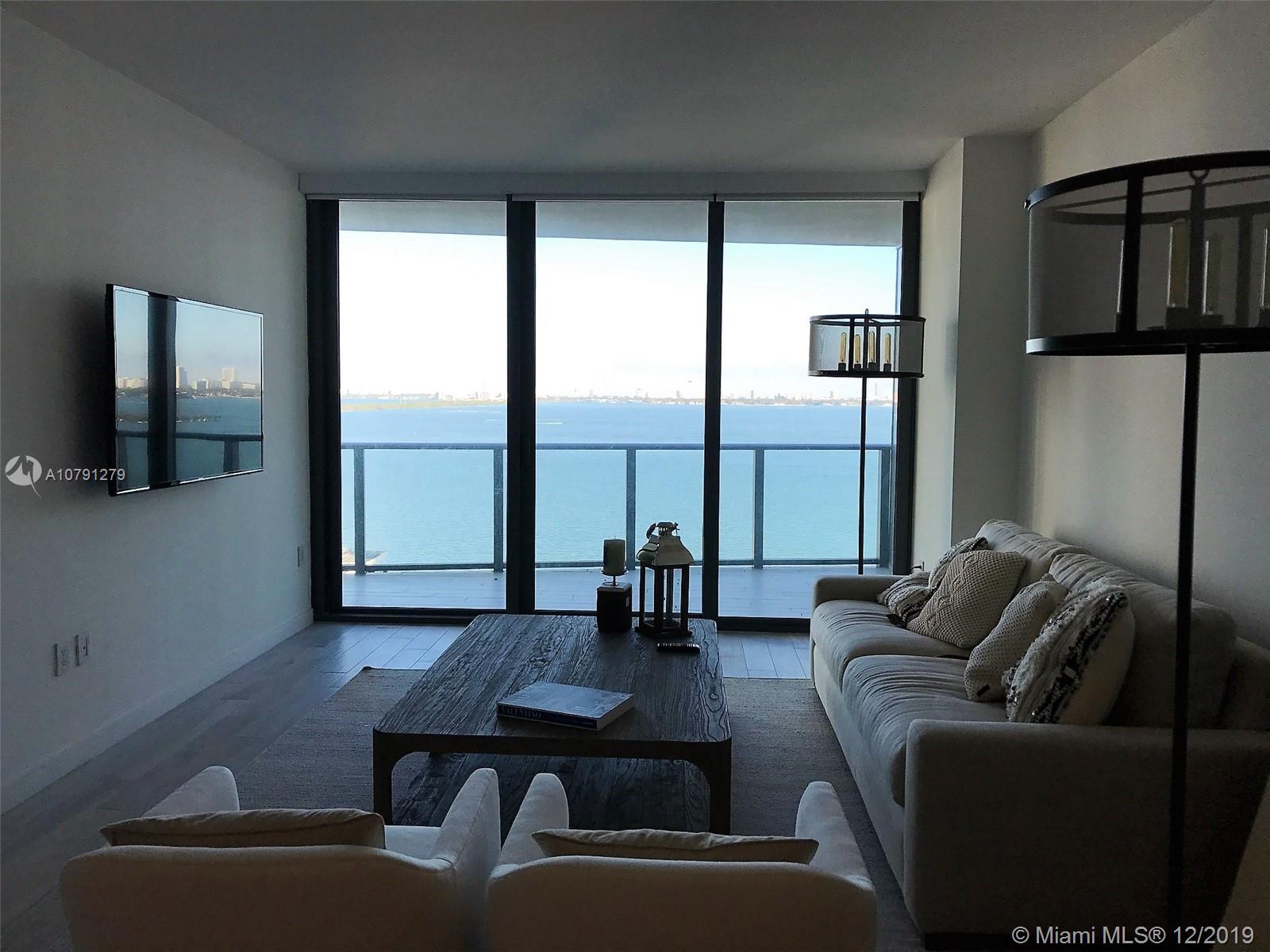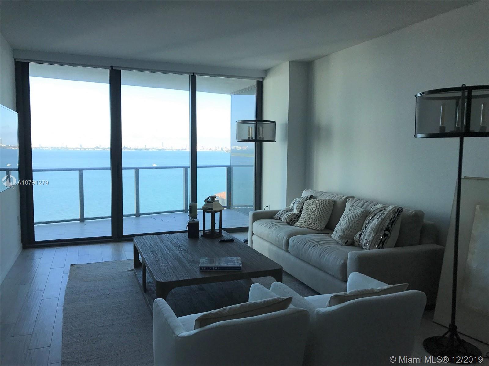 Incredible endless water views of Biscayne Bay. Newer 2 bed/2 baths w/private elevators & private foyer. Gourmet European Kitchen w/island and state of the art appliances. Sunk in tub in 2nd bath and sleek glass shower in master bath. Nicely upgraded unit with porcelain wood-like floors, custom designed closets, automated window shades, custom lighting and large terrace. Like new, never rented, never lived in, only occasionally by owners as a second home. Luxurious building with fine art and state of the art amenities: tennis, media room, billiards, sauna, gym, and pool overlooking the bay.