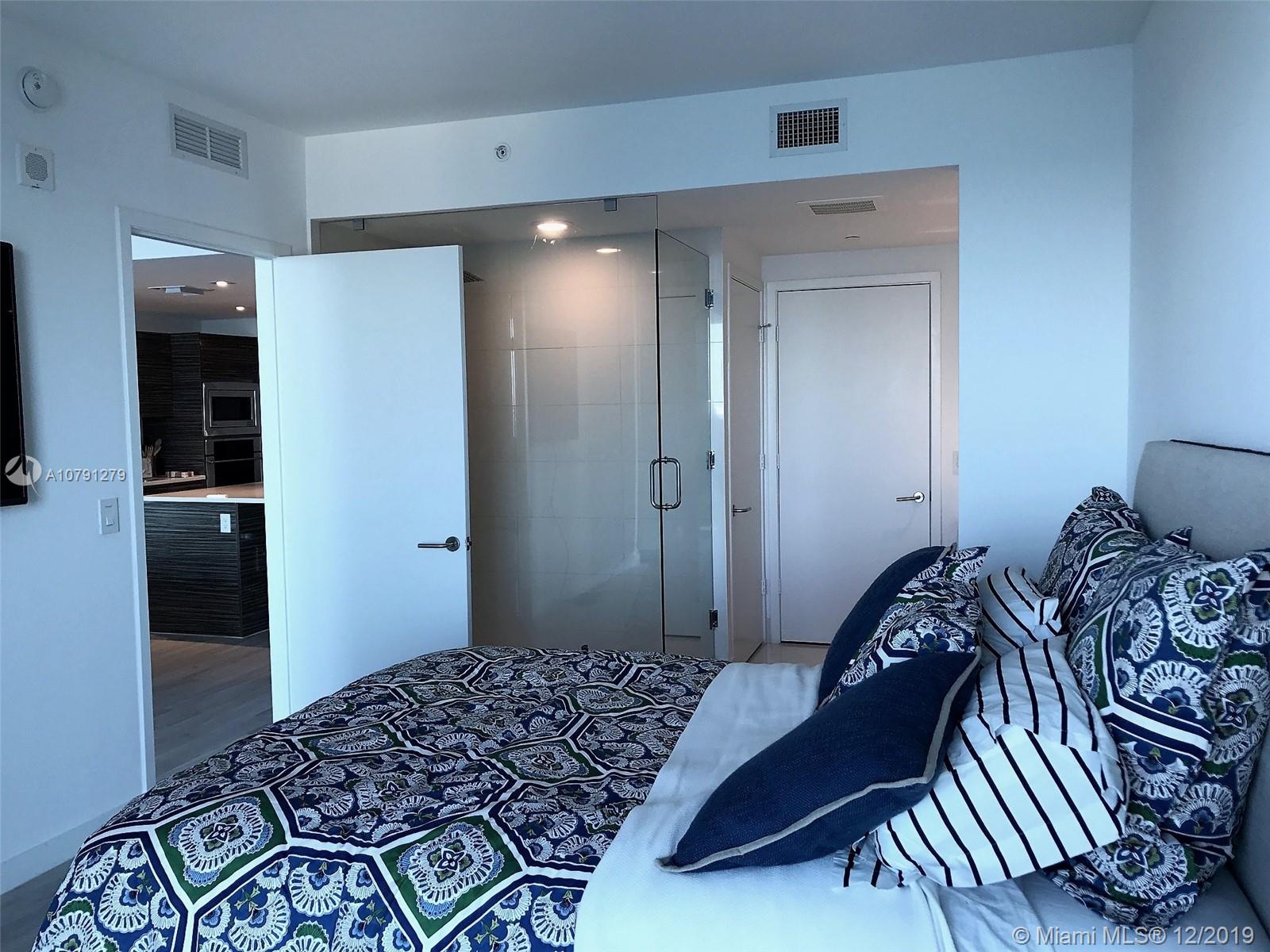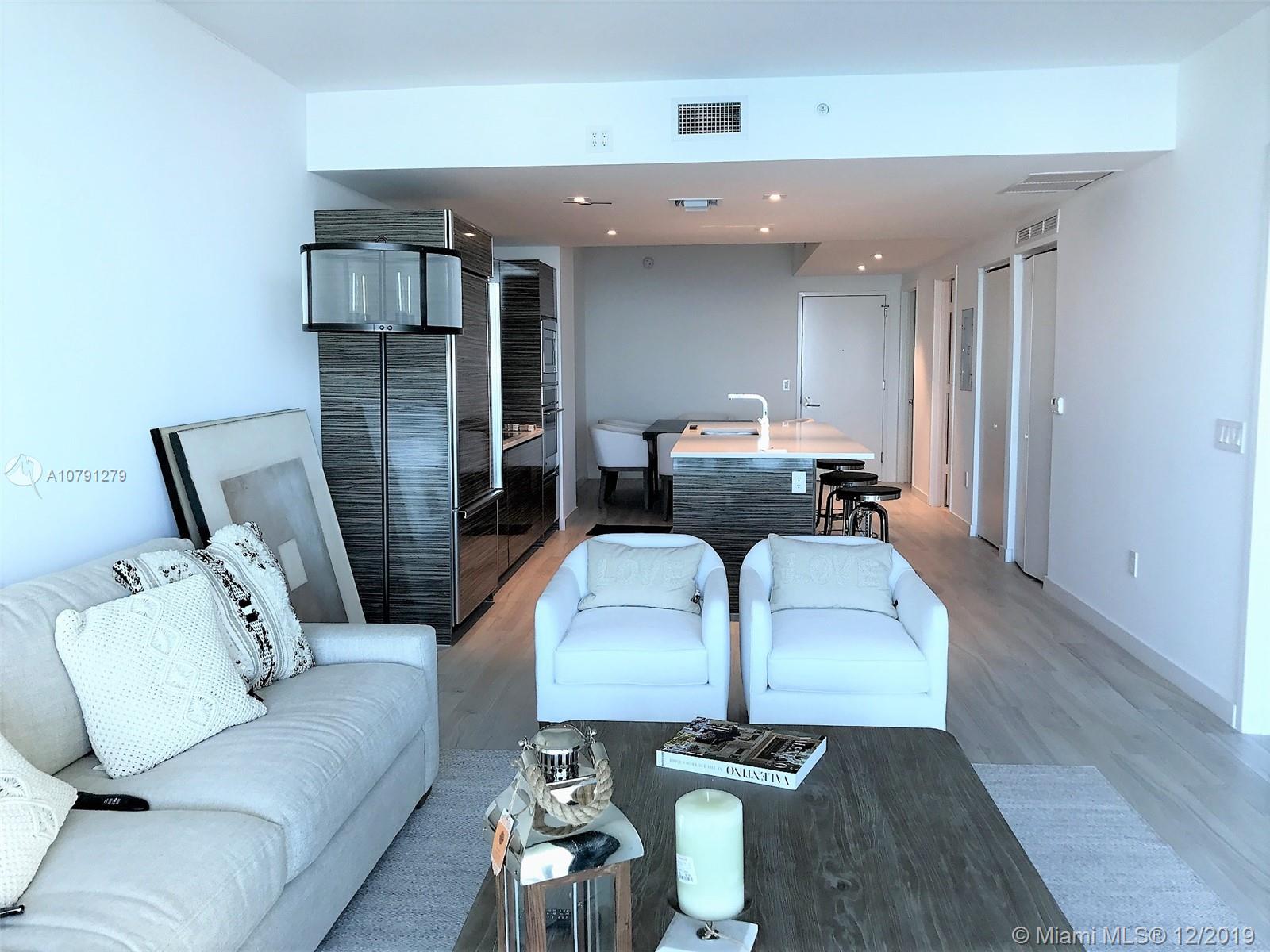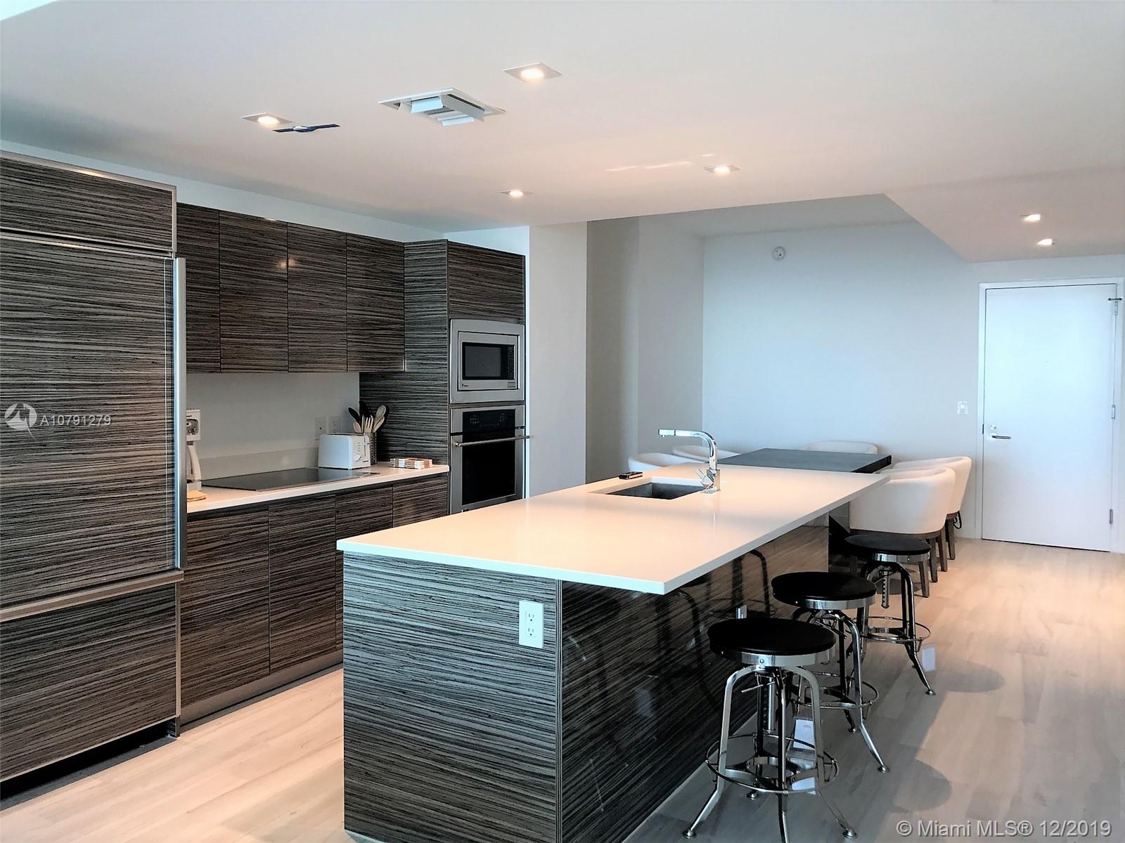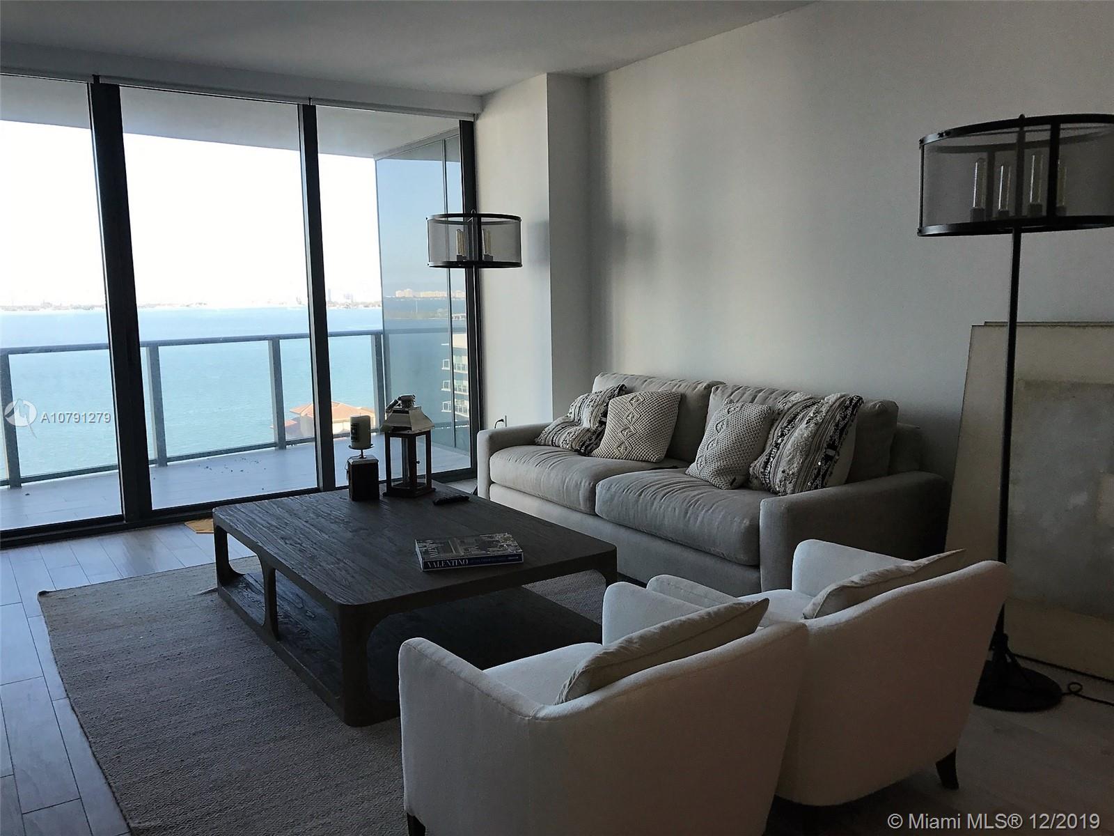 Incredible endless water views of Biscayne Bay. Newer 2 bed/2 baths w/private elevators & private foyer. Gourmet European Kitchen w/island and state of the art appliances. Sunk in tub in 2nd bath and sleek glass shower in master bath. Nicely upgraded unit with porcelain wood-like floors, custom designed closets, automated window shades, custom lighting and large terrace. Like new, never rented, never lived in, only occasionally by owners as a second home. Luxurious building with fine art and state of the art amenities: tennis, media room, billiards, sauna, gym, and pool overlooking the bay.