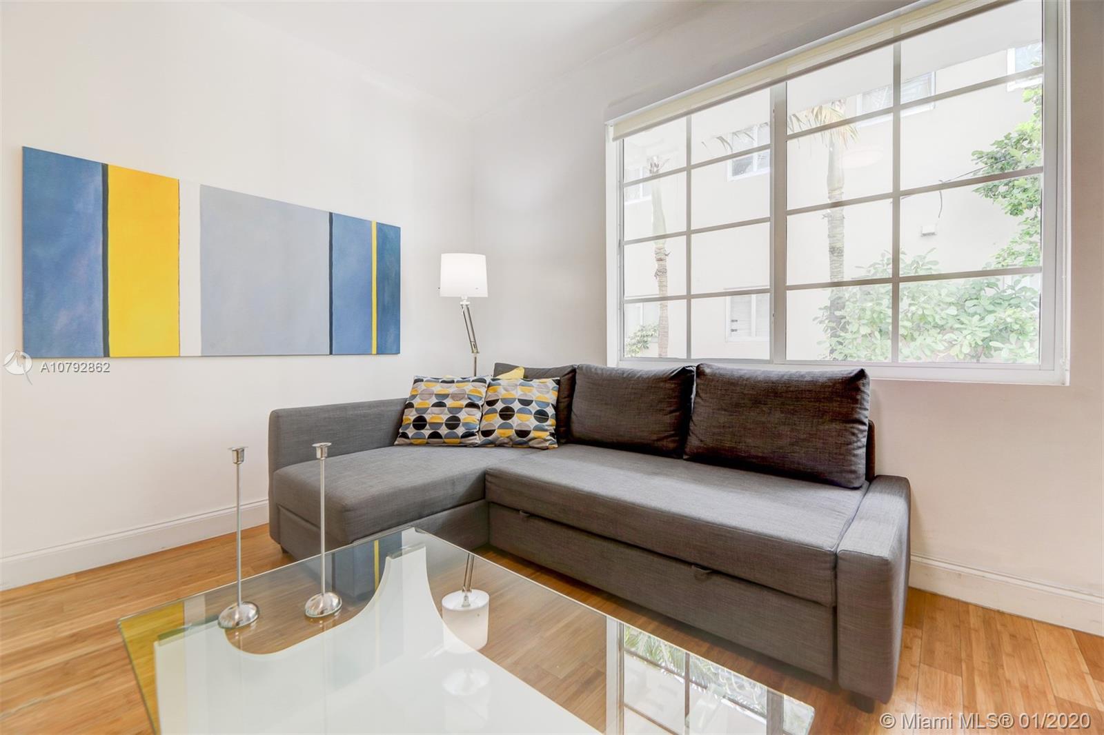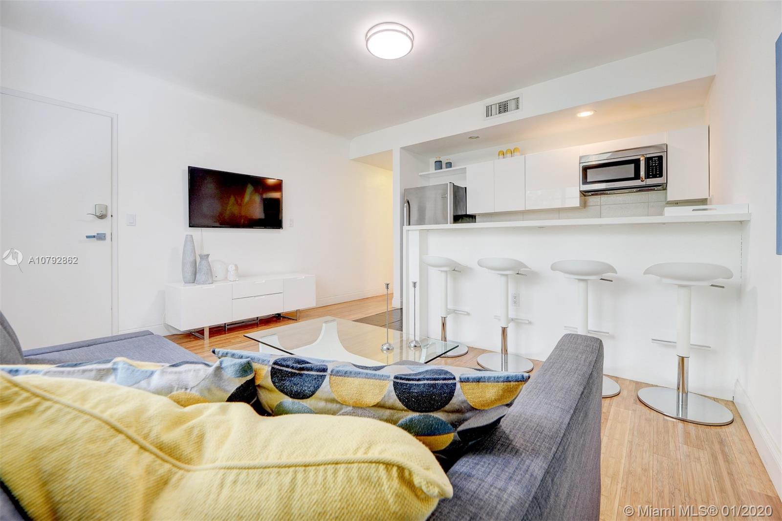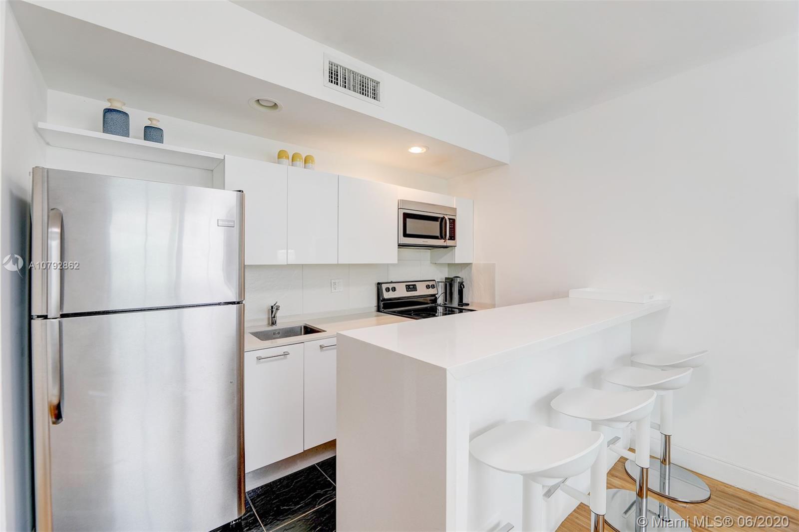 Turn-Key Art Deco charm in the heart of South Beach!! This renovated and ready to move-in one bedroom apartment is located on a quiet building only 2 blocks from Lincoln Road Mall, Flamingo Park and 5 blocks from famous Ocean Drive/Beach. All white kitchen cabinets with quartz countertop and stainless steel appliances. High counter with bar stools. Central A/C, Washer/Dryer Combo for added convenience. Very spacious modern bath with frameless shower door. Oversized window bringing natural light into the apartment. Enjoy South Beach Living or use as your own vacation getaway. Apartment comes fully furnished including appliances, electronics, housewares, linens, art work and decoration. South Beach Photo Credit - Eric Giuliani