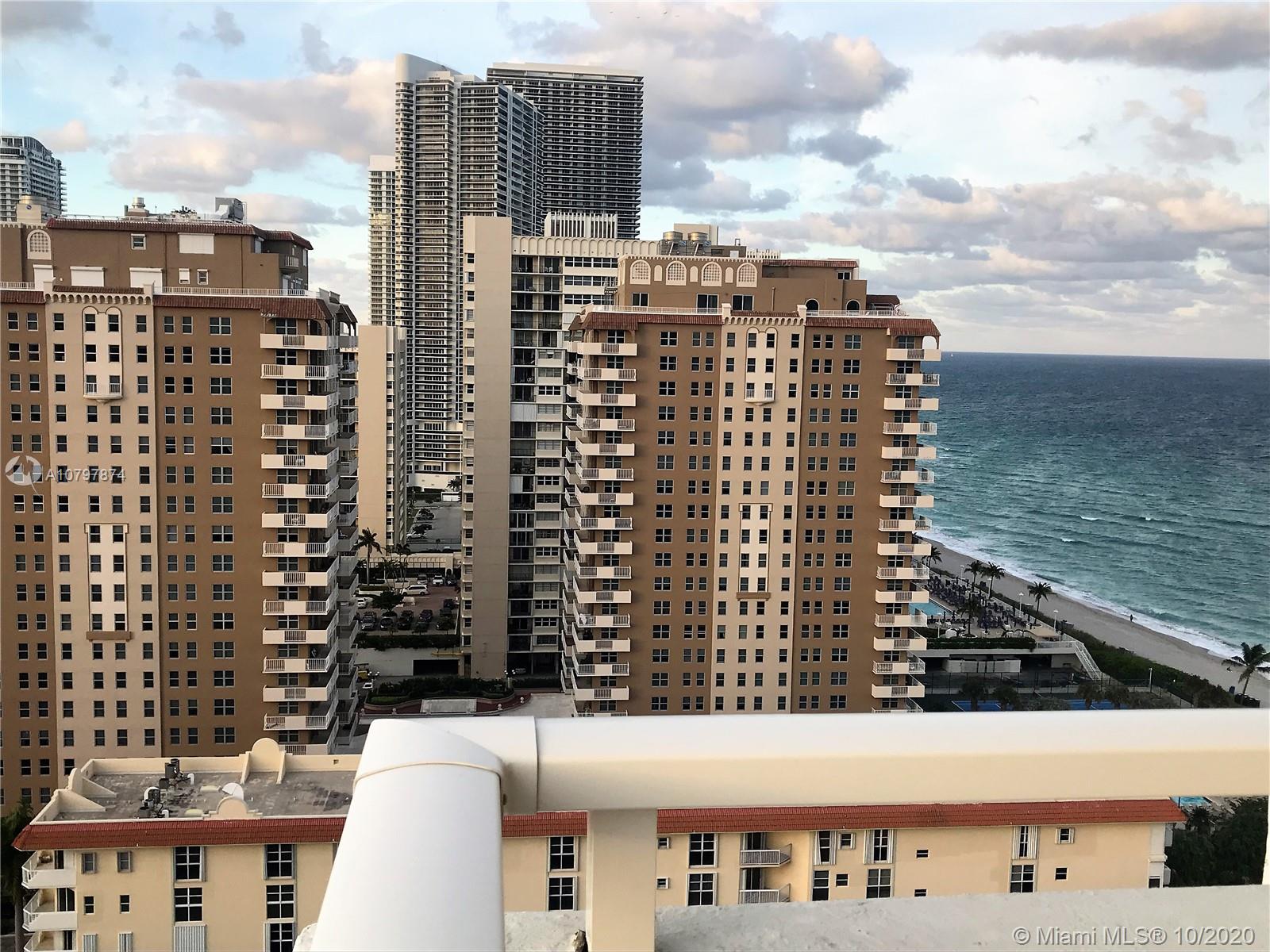 Ocean front corner unit. Floors throughout. Large balcony with amazing views. Walk in closets. A/C, Cable, Internet, Water, Garage Parking Included. Lots of Amenities. Snack bar by the pool 2 Restaurants, Bar, 2 Pools, 2 GYMS, Tennis & Basketball Courts, Putting Green, Shuffleboard, Billiards, BBQ, Courtesy bus, and much more. Centrally located minutes away from shops, dining and entertainment. Near the famous Hollywood boardwalk and Gulf Stream Casino.