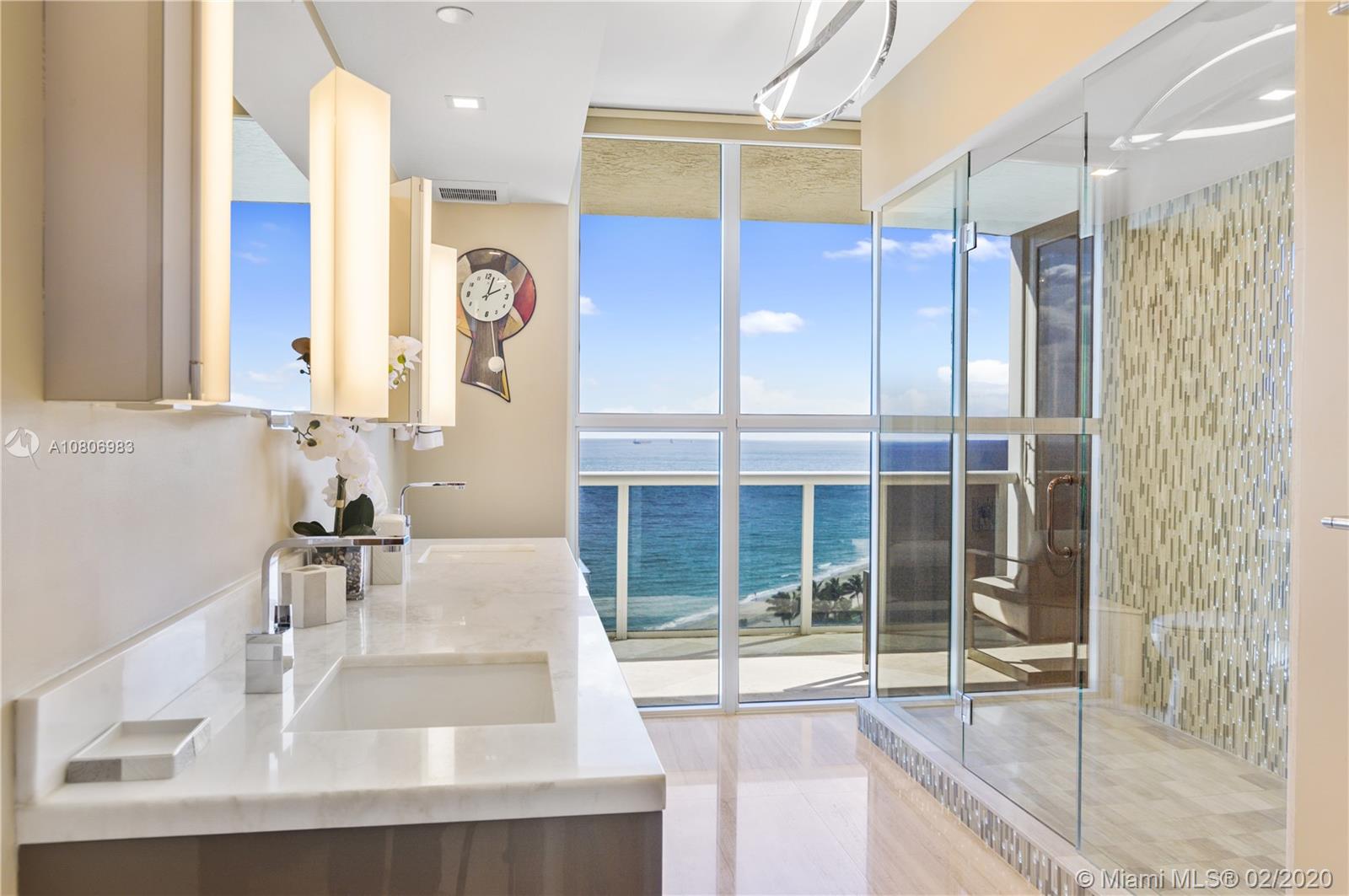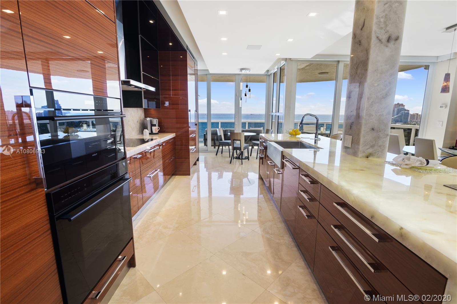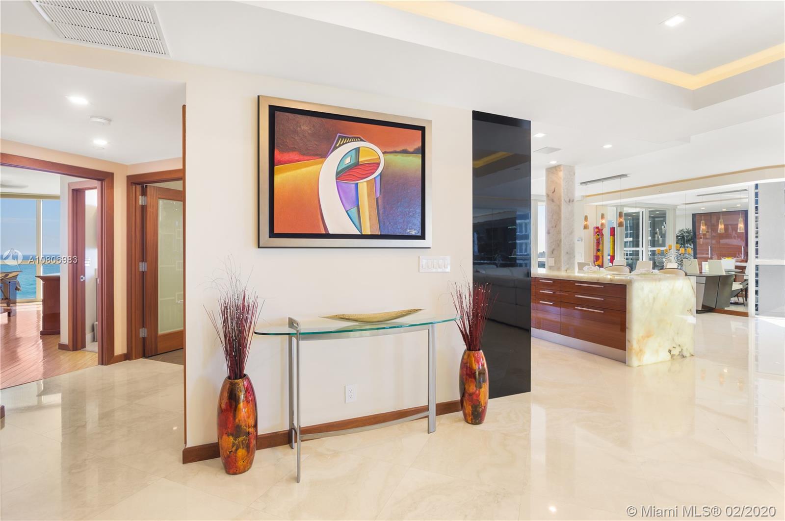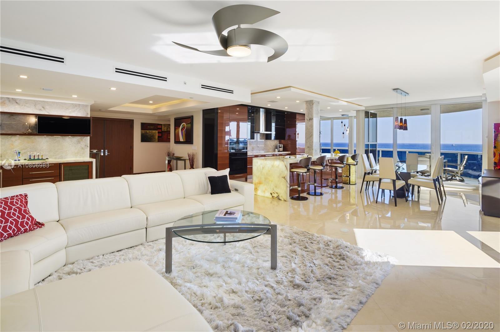 Step off private elevator into gleaming, chic & sophisticated 3BR/3BA 2600SF rarely available 08 flow-through residence. New expansive impact windows perfectly frame glorious ocean view to east & city west. Fully upgraded w/impeccable materials & vision, showcasing 24x24 travertine floors, backlit soffits, Italkraft cabinetry, floating ceiling & Wetbar w/ULine bev fridge & wine cooler. Chefs kitchen w/underlit 12' quartzite island, high-end appliances & designer touches thruout. Master suite has sweeping ocean views, custom closets, speaker system & luxurious bath w/Toto toilets, big shower, multiple heads, and Keuco vanity mirrors w/storage & lights. Upscale, one-of-a-kind masterpiece in a bldg that sits on 10 acres of beachfront land.Resort-style amenities: valet/tennis/gym/pool/cafe