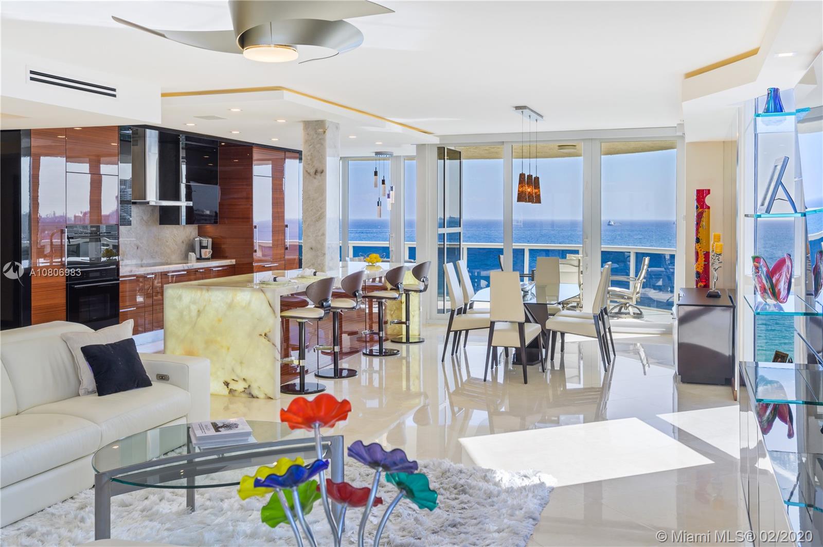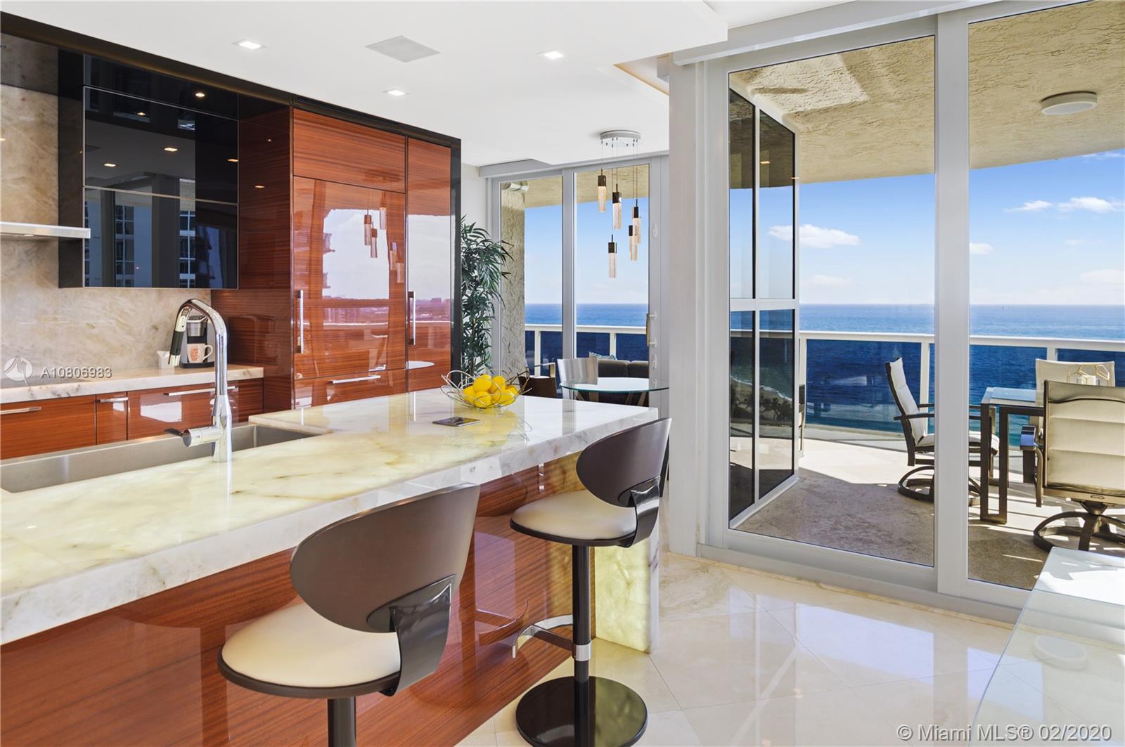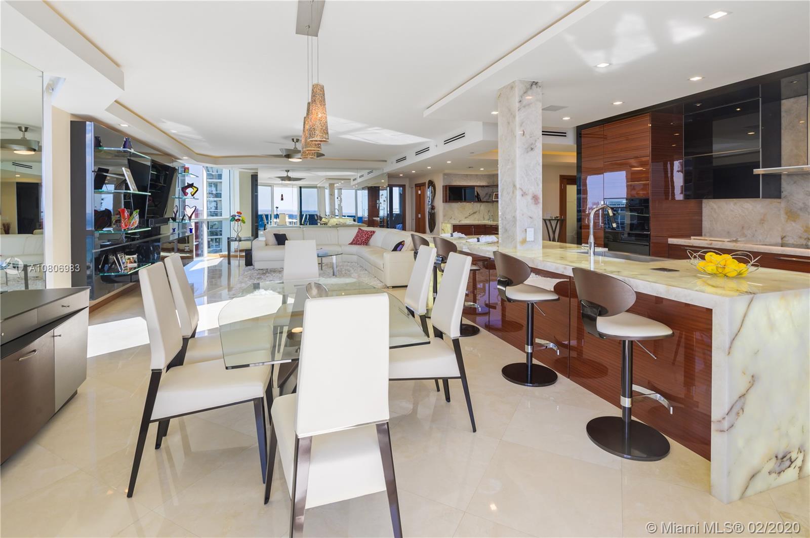Step off private elevator into gleaming, chic & sophisticated 3BR/3BA 2600SF rarely available 08 flow-through residence. New expansive impact windows perfectly frame glorious ocean view to east & city west. Fully upgraded w/impeccable materials & vision, showcasing 24x24 travertine floors, backlit soffits, Italkraft cabinetry, floating ceiling & Wetbar w/ULine bev fridge & wine cooler. Chefs kitchen w/underlit 12' quartzite island, high-end appliances & designer touches thruout. Master suite has sweeping ocean views, custom closets, speaker system & luxurious bath w/Toto toilets, big shower, multiple heads, and Keuco vanity mirrors w/storage & lights. Upscale, one-of-a-kind masterpiece in a bldg that sits on 10 acres of beachfront land.Resort-style amenities: valet/tennis/gym/pool/cafe