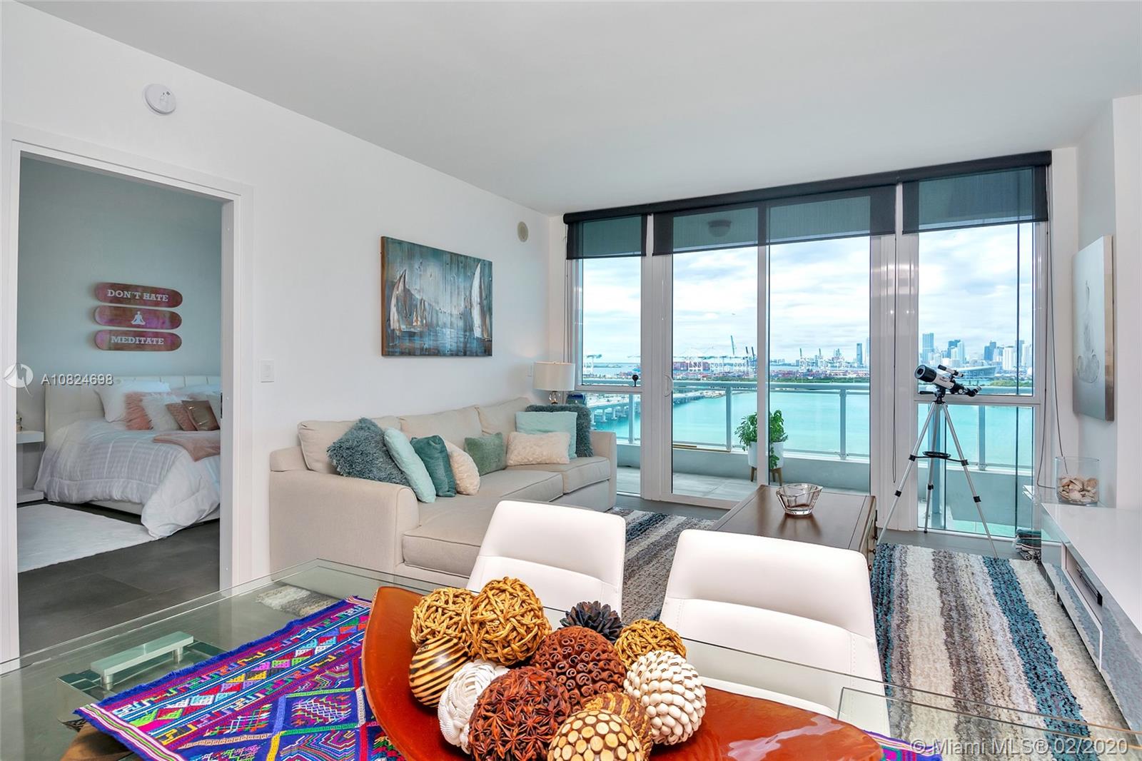 Stunning bay front 1 bed, 1 bath unit at The Bentley Bay North features 779 sq. ft. of unobstructed bay and city skyline views. Elegantly designed interiors include marble countertops, expansive floor to ceiling windows, imported European cabinetry, stain less steel appliances and large private terrace facing the water. Sound insulted master suite boasts walk in closets and a separate soaking tub and seamless glass shower. Located within very close distance of SoBe's top shopping and dining destinations.