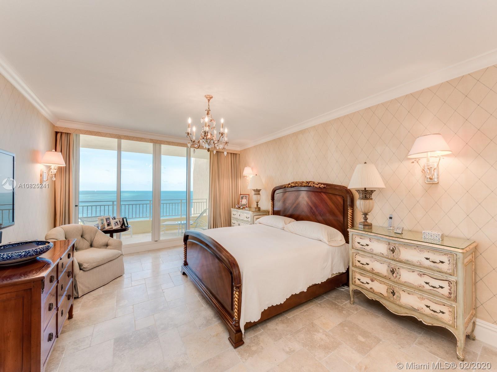Sweeping floor-thru views of Atlantic Ocean and Miami Skyline from Living and Master Bd. areas, and Biscayne Bay, Cape Fl. and lighthouse, from this most sought after "D model" apartment. * * * Step out of your private elevator right into this oversize 3 bd. (en suite) plus separate staff quarters, 4 and a half baths. Formal living and dining rooms. Kitchen/family room combo may be converted into eat-in kitchen and bedroom #4. Marble floors in all social areas. Easy to show by appointment.