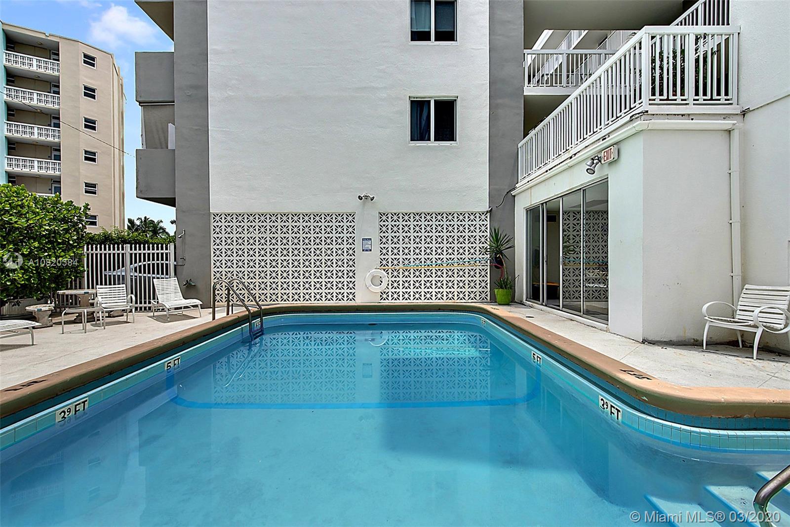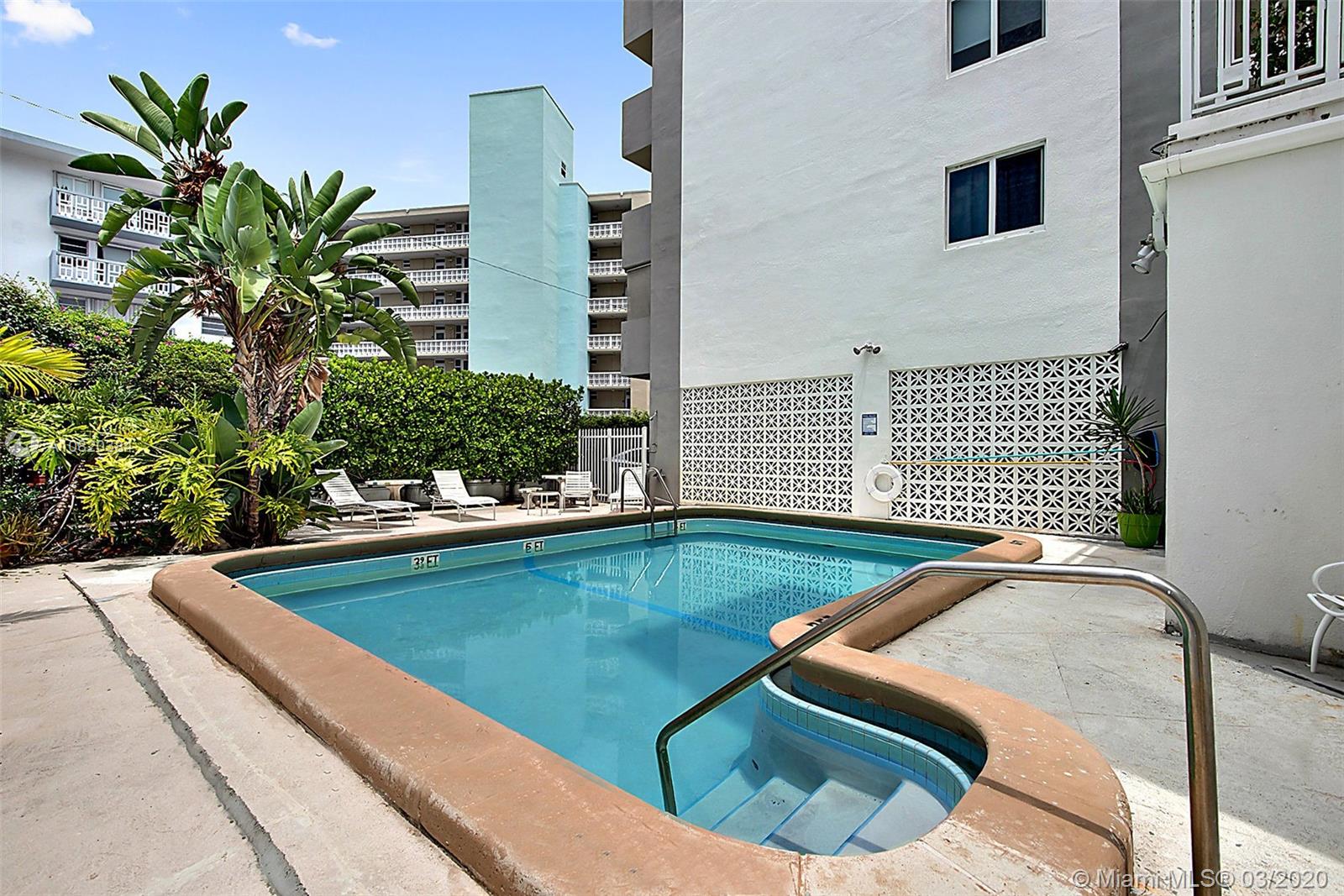 Beautifully maintained building in Miami Beach. Gated, with high impact glass, new roof, elevator and Laundry Facilities. Pool and Gym are on site. Walking distance to Lincoln Rd, Fresh Market and Cinemas. Great large unit at the top floor of the building. Tile floors throughout. New kitchen cabinetry with granite counter tops. Updated bathroom. Bedroom and living room opens to the balcony with views of the bay, park and Port of Miami. Unit includes 1 assigned parking space, pet friendly building and allow rentals.
