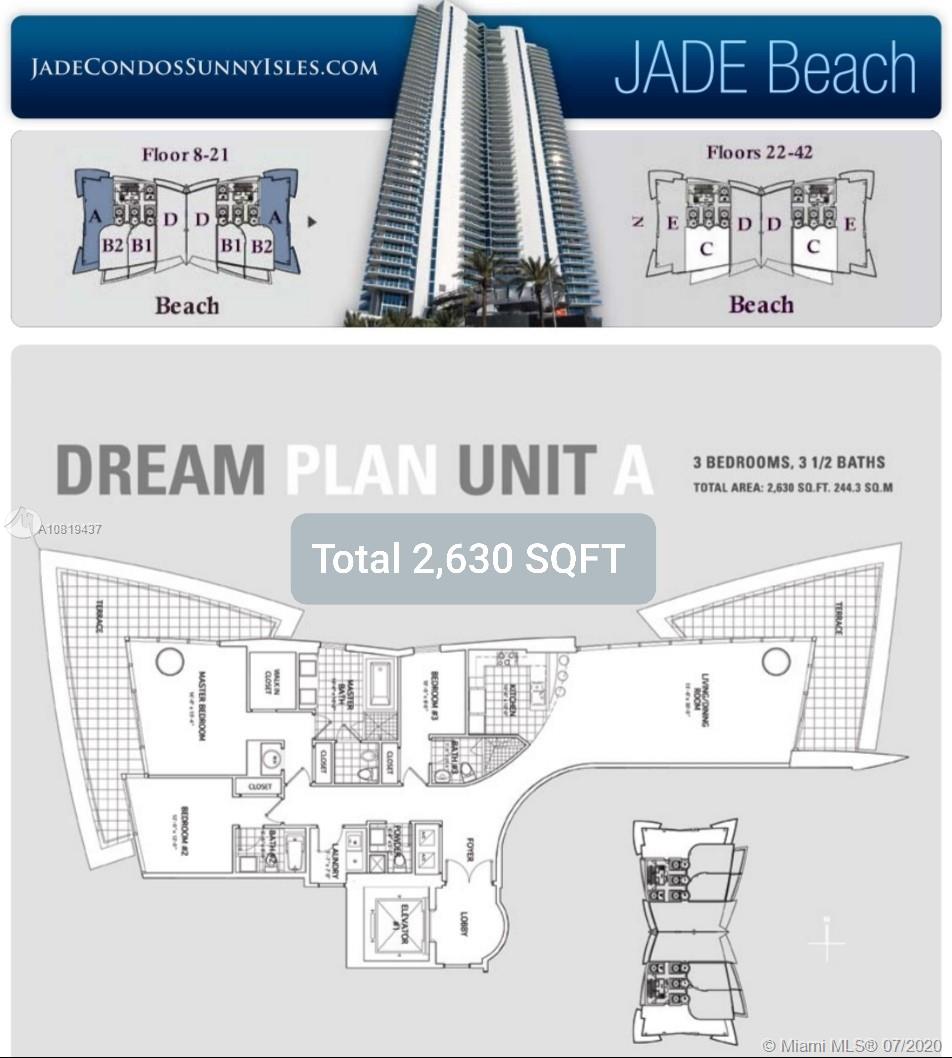 JADE BEACH 1908, (See Broker Bonus Remarks) REDUCED to $ 1,499,000 from $ 1,775,000. Show this unit for last. This is The last 3 Bedroom unit belo $ 1,5 M. Will not last, The best deal in Sunny Isles, CORNER UNIT w/ Total 2,630 SQFT, 2 Assigned PARKING (Most units has just 1, this is $ 35,000 parking included in the price) This unit has state-of-the-art electronics, and motorized shades & blackouts, Fully furnished by famous Artefacto Designer (Negotiable) invoice cost was over $200,000, Amazing glass walls thru & thru views with 360 degrees of DIRECT OCEAN FRONT & Intercostal Bay, huge 3 BED, 3.5 BATH, gorgeous SUNRISE & SUNSET views wrap-around balconies. SEE MLS A10767497 sold unit JB 1508 sold for $ 1,450,000, # 1604 - Sold $ 1,444,000, # 4008 - Sold for $ 2,100,000 or $ 867 SF.