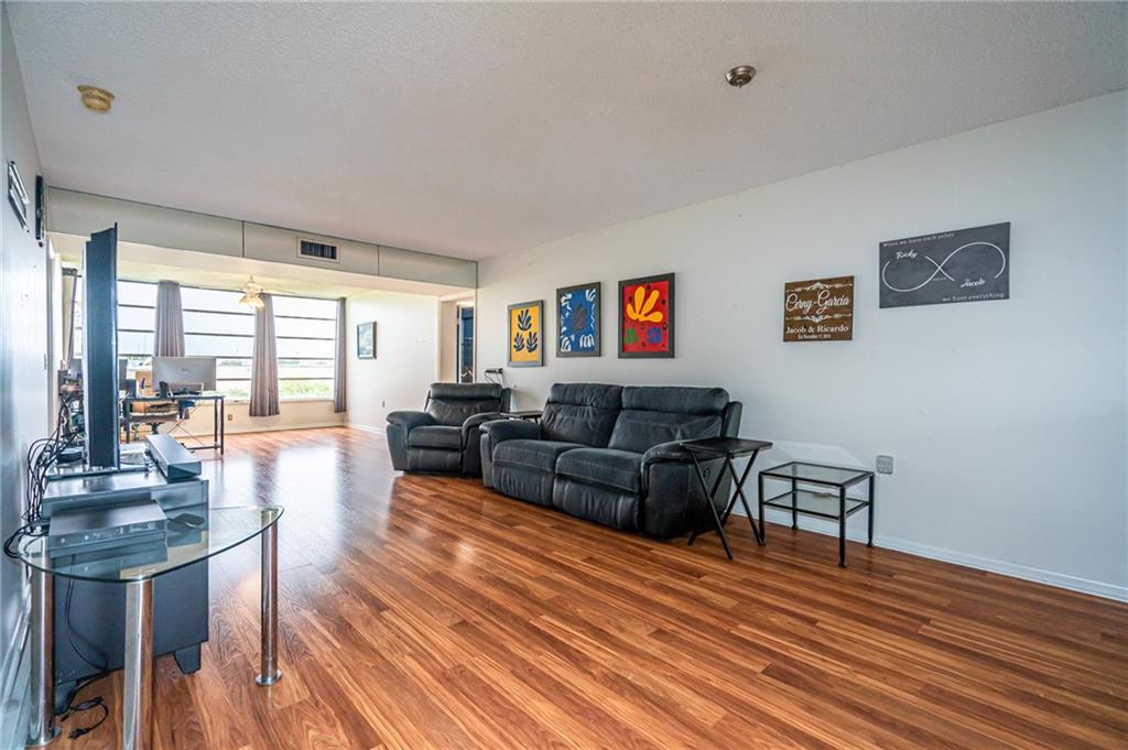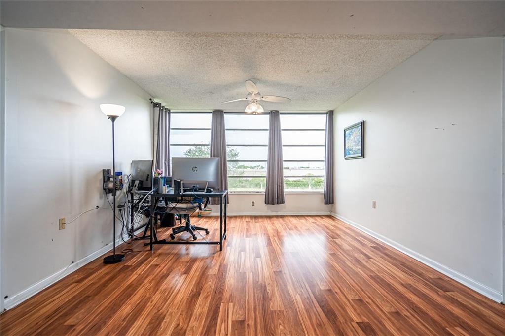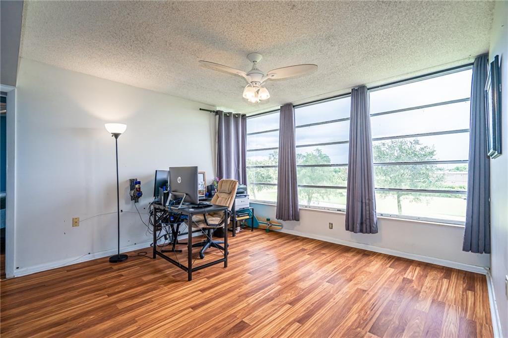 Spacious condo with tons of privacy. The two-bedroom, two full bathroom condo overlooks the 15th hole of the Pine Island Ridge Golf Course and features a bright open floor plan. The unit has updated laminate wood flooring through-out the living room, dining room, bedrooms. The master suite has large walk-in closet and private bathroom. The unit features an extra-large laundry/utility room and bonus room that could be extra storage or den. The kitchen features updated stainless steel appliances, slate countertops, backsplash, and tons of natural light. Pine Island Ridge Country Golf Club membership included at no additional cost, access to two private restaurants, library, gym, pool, tennis courts, BBQ, and more. Top-rated school district, easy access to 595, Turnpike and I 75 and Airport.