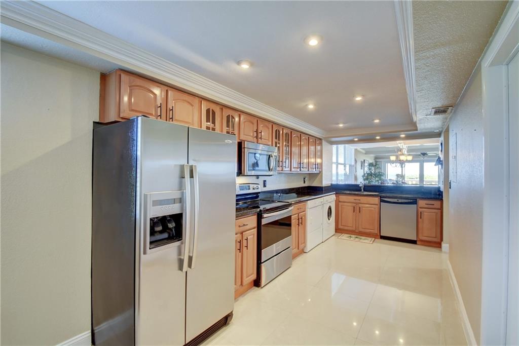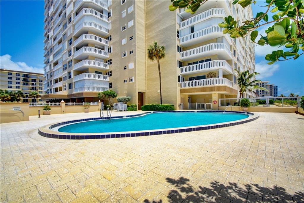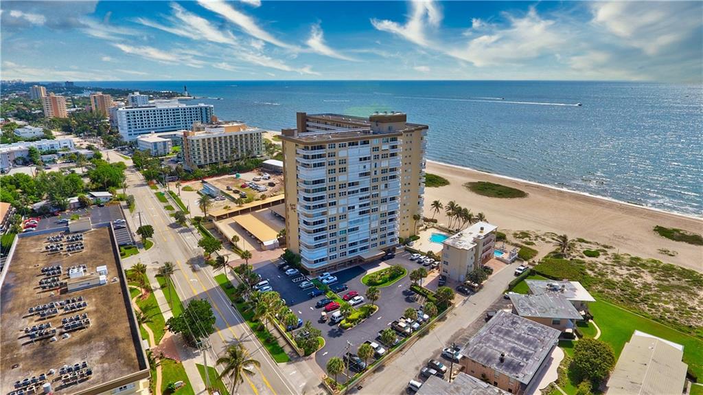 Completely updated turnkey northeast corner unit with unobstructed direct ocean views and large wrap around balcony. This raised first floor unit with private entry is perfect to park outside your door and walk right into your beachfront slice of paradise. No need to walk through the lobby. Eat in kitchen with granite counters, breakfast bar, stainless steel appliances, full size washer and dryer inside the unit, hurricane impact windows and doors and coffered ceilings. Both ac and water heater newer. Oceanside heated pool, fitness center, 24 hour concierge, community room, BBQ grills, car wash and extra storage. Shuffleboard. Views of the brand new Pompano Pier. 55 and older building- low monthly maintenance. Turnkey