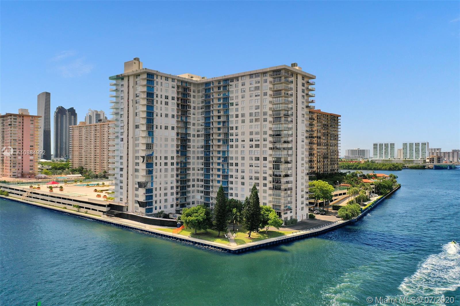 Spectacular light-filled corner unit with WATER VIEWS from every window! This 3 bedroom, 3 full bathroom unit has 9' high ceilings and an expansive floor plan with PORCELAIN tile and wood floors, a newly renovated kitchen with soft-close shaker-style cabinets, QUARTZ countertops, Samsung STAINLESS STEEL appliances, an office nook, lots of closets and huge WALK-IN CLOSETS with custom cabinetry, NEWER A/C, and a split-bedroom floor plan for the utmost privacy for your guests. A private park in front of the unit makes this unit a peaceful retreat and gives it a homey feel, unlike any other condo. LOW HOA fees! IDEAL LOCATION - 10 min walk(or take shuttle) to Sunny Isles Beach, 10 min drive to Aventura mall, close to Gulfstream!