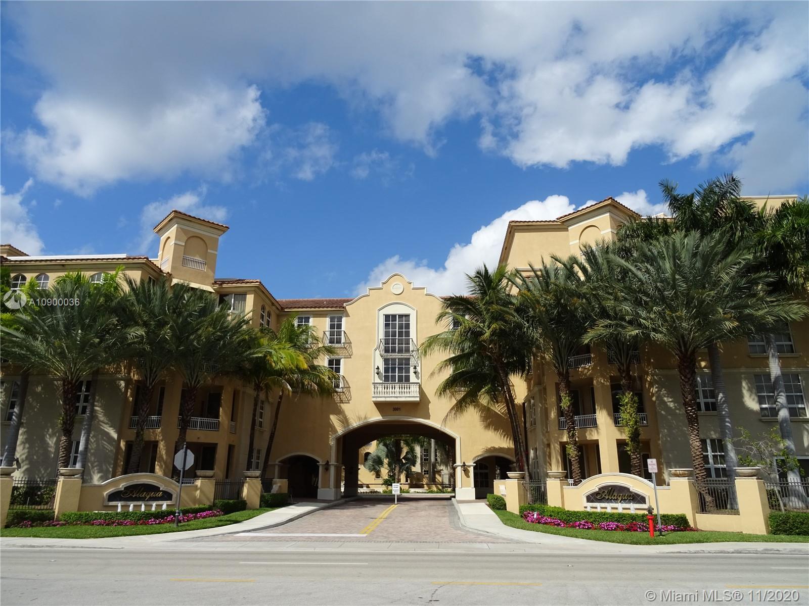 INVITING and spacious 2 beds 2 baths (1,343 sq.ft. - plus 2 terraces) residence located on the 5th floor with 10' high ceilings, fantastic floor plan w/ split bedrooms overlooking the pool area in the beautiful City of Aventura. Move-In Condition, Open kitchen with granite countertops, cherry wood cabinets, stainless steel appliances, huge bathrooms. Washer and Dryer inside of the unit. Alaqua is a Mediterranean style waterfront, gated community in a great location, great schools, house of worship, parks, just minutes away from the Aventura Mall and THE BEACH. Pets & Rental OK. 2 assigned/covered parking spaces & awesome amenities: tropical lushly landscaped pool area, Gym , Community Room and much more…